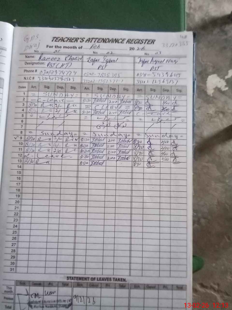 | Name: RA**** KH**** Designation: (School Headmaster's/Headmistress's) PST Phone/Cell Number: 03**** |
