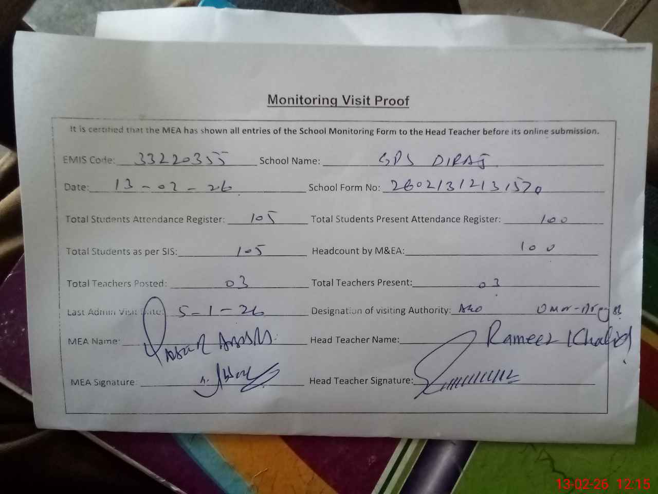 | Attendance Register | Head Teacher | MEA with School | Visit Proof |