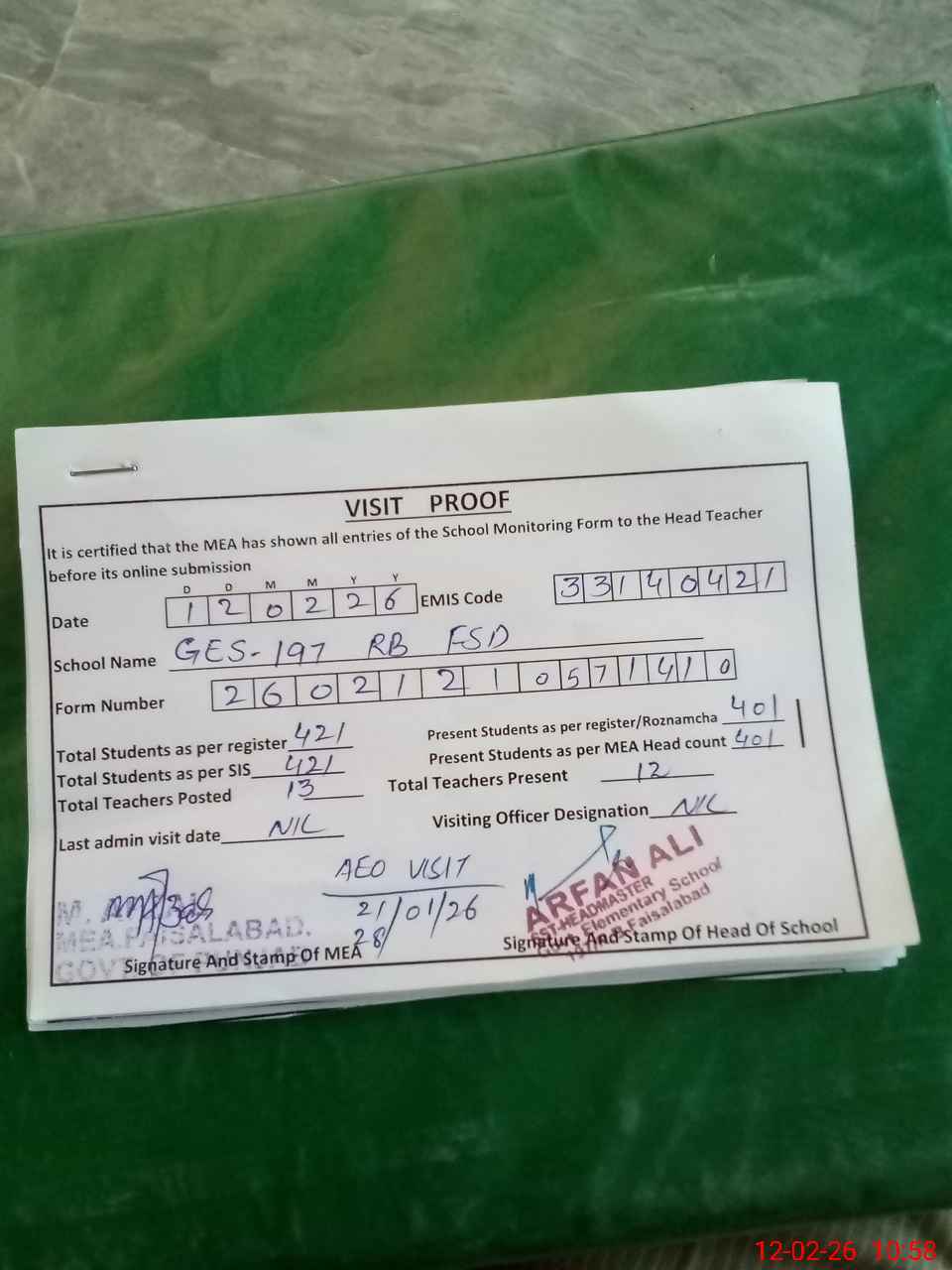 | Attendance Register | Head Teacher | MEA with School | Visit Proof |