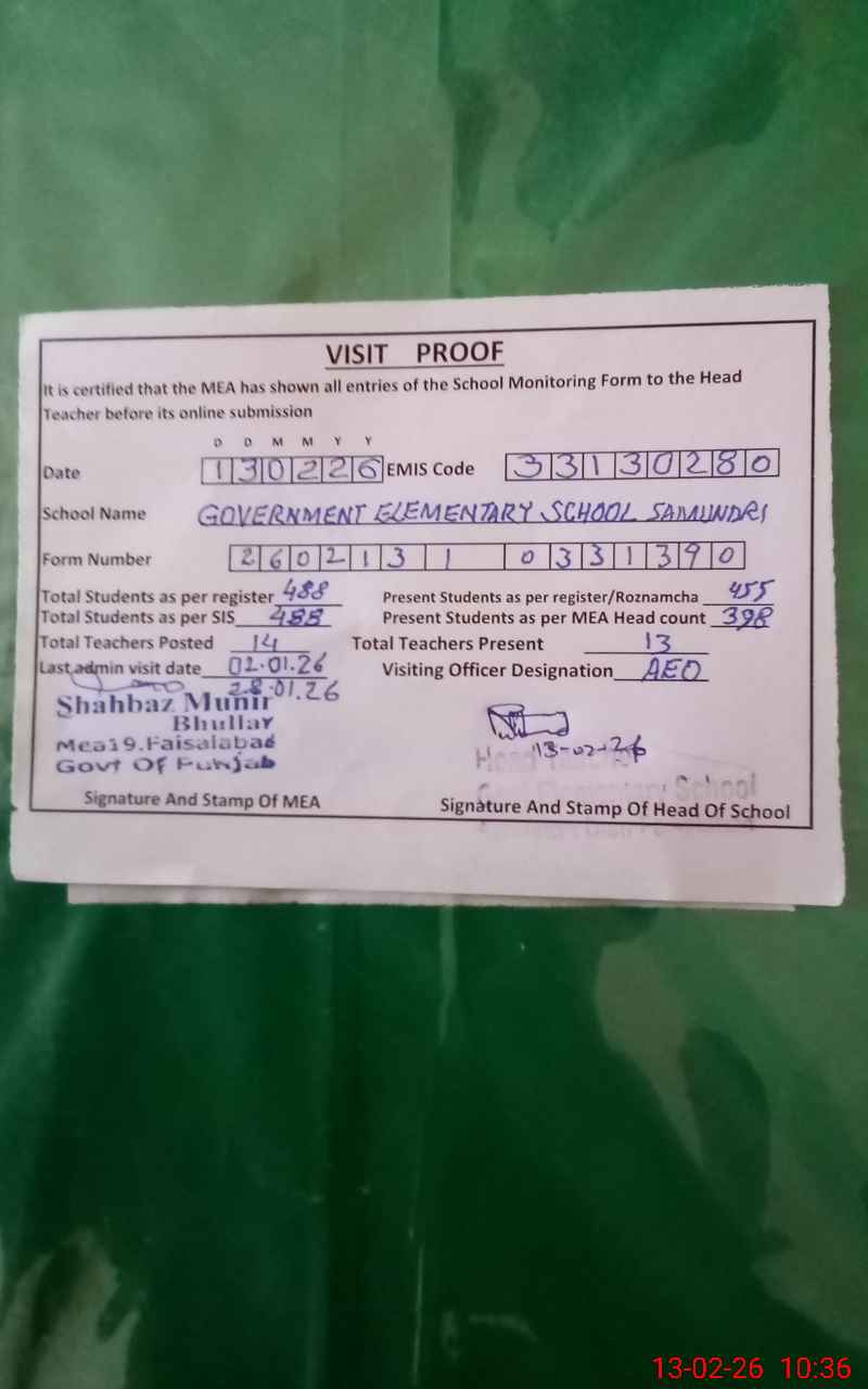 | District: FAISALABAD | Tehsil: SAMUNDARI | Markaz: SAMMUNDRI 2 - MALE | Level: Middle | |