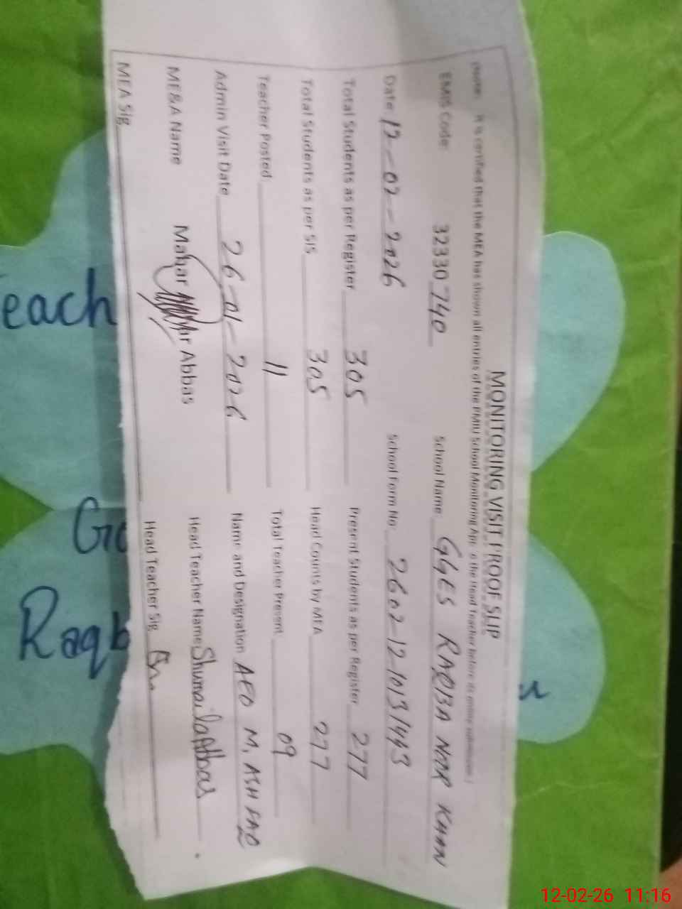 | EMIS Code: 32330740 | Name of School: GGES RAQBA NOOR KHAN | |||