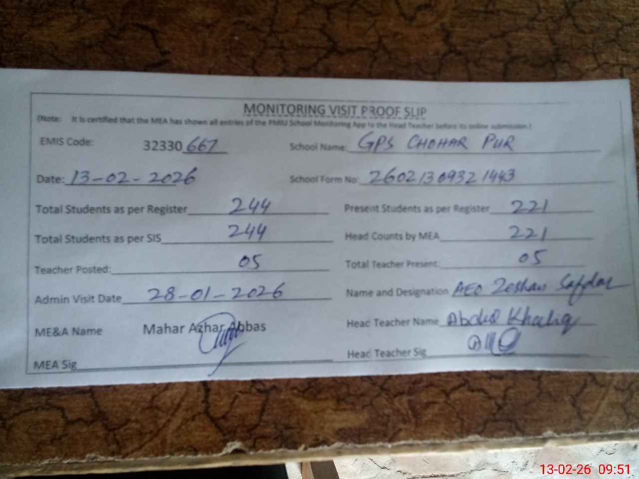 | EMIS Code: 32330667 | Name of School: GPS CHOHAR PUR | |||