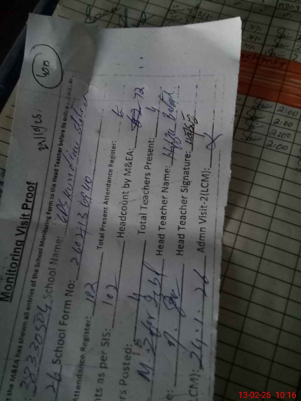 | Attendance Register | Head Teacher | MEA with School | Visit Proof |