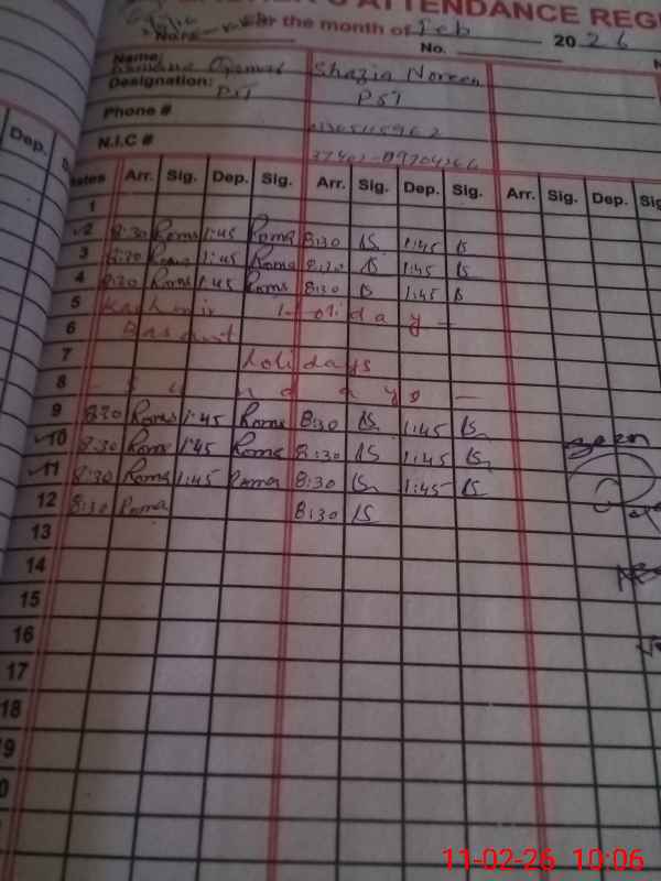 | CNIC | Full Name | Designation | R/C | Absence During Last Calender Month |
