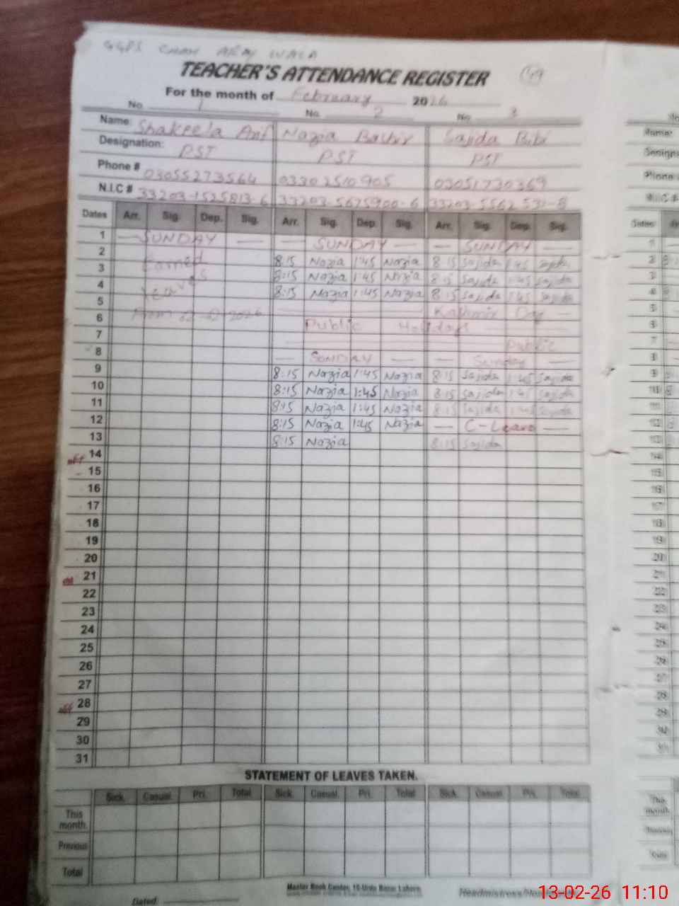 | CNIC | Full Name | Designation | R/C | Absence During Last Calender Month |