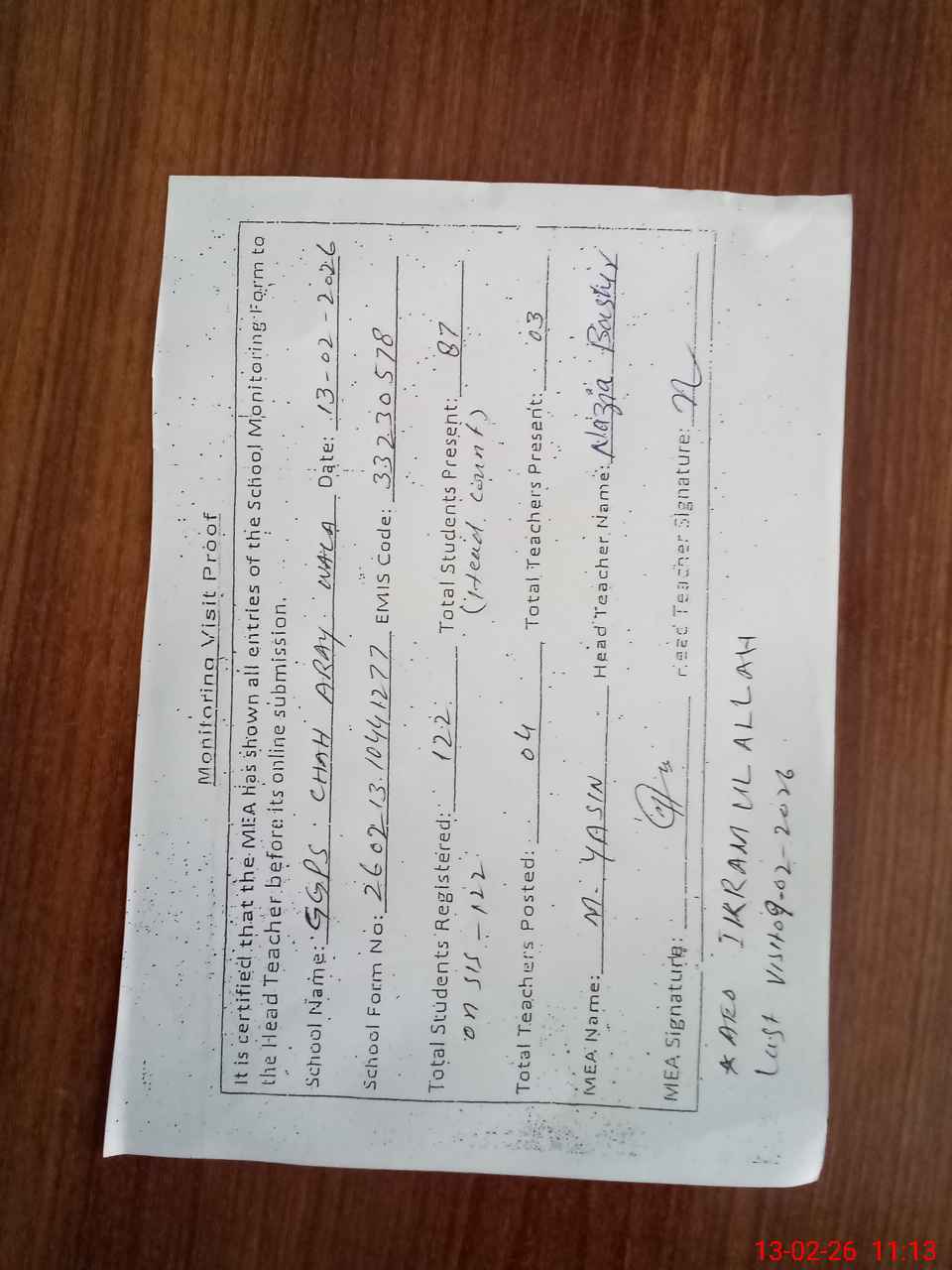 | Attendance Register | Head Teacher | MEA with School | Visit Proof |