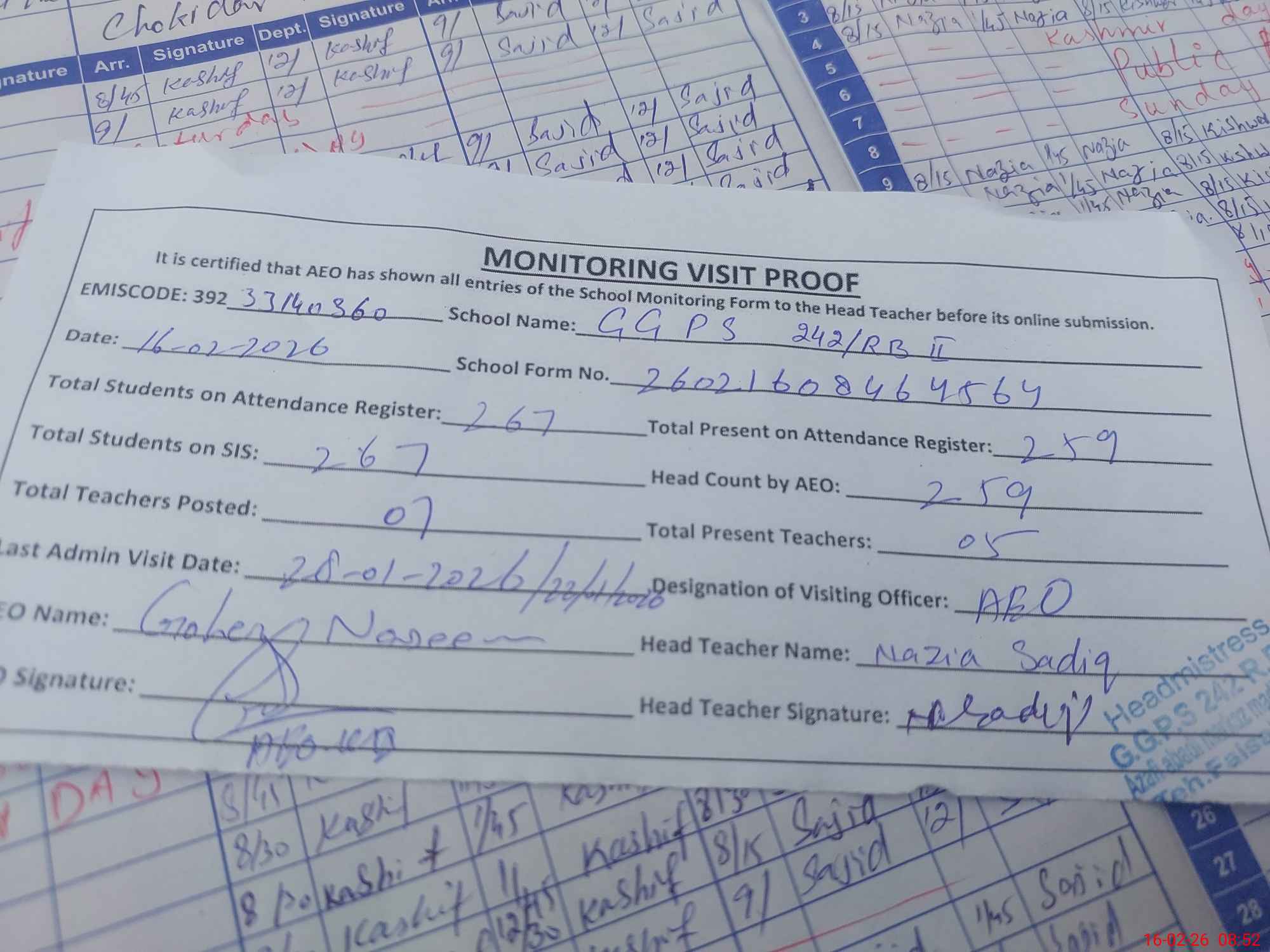 | Attendance Register | Head Teacher | MEA with School | Visit Proof |