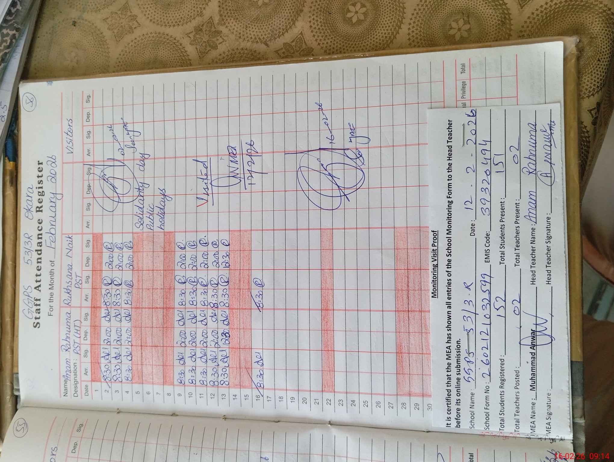 | Attendance Register | Head Teacher | MEA with School | Visit Proof |