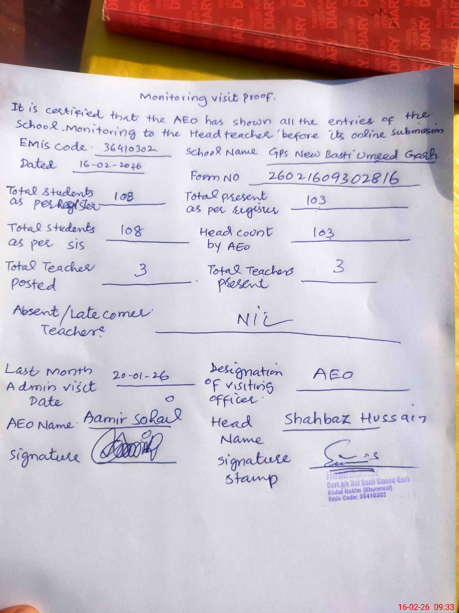 | Attendance Register | Head Teacher | MEA with School | Visit Proof |