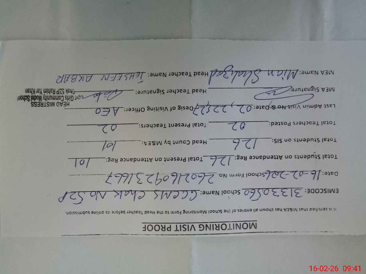 | Certified that this School was Inspected by the Undersigned MEA/DMO Today and the Information Stated Above is as Per Record. | |||||