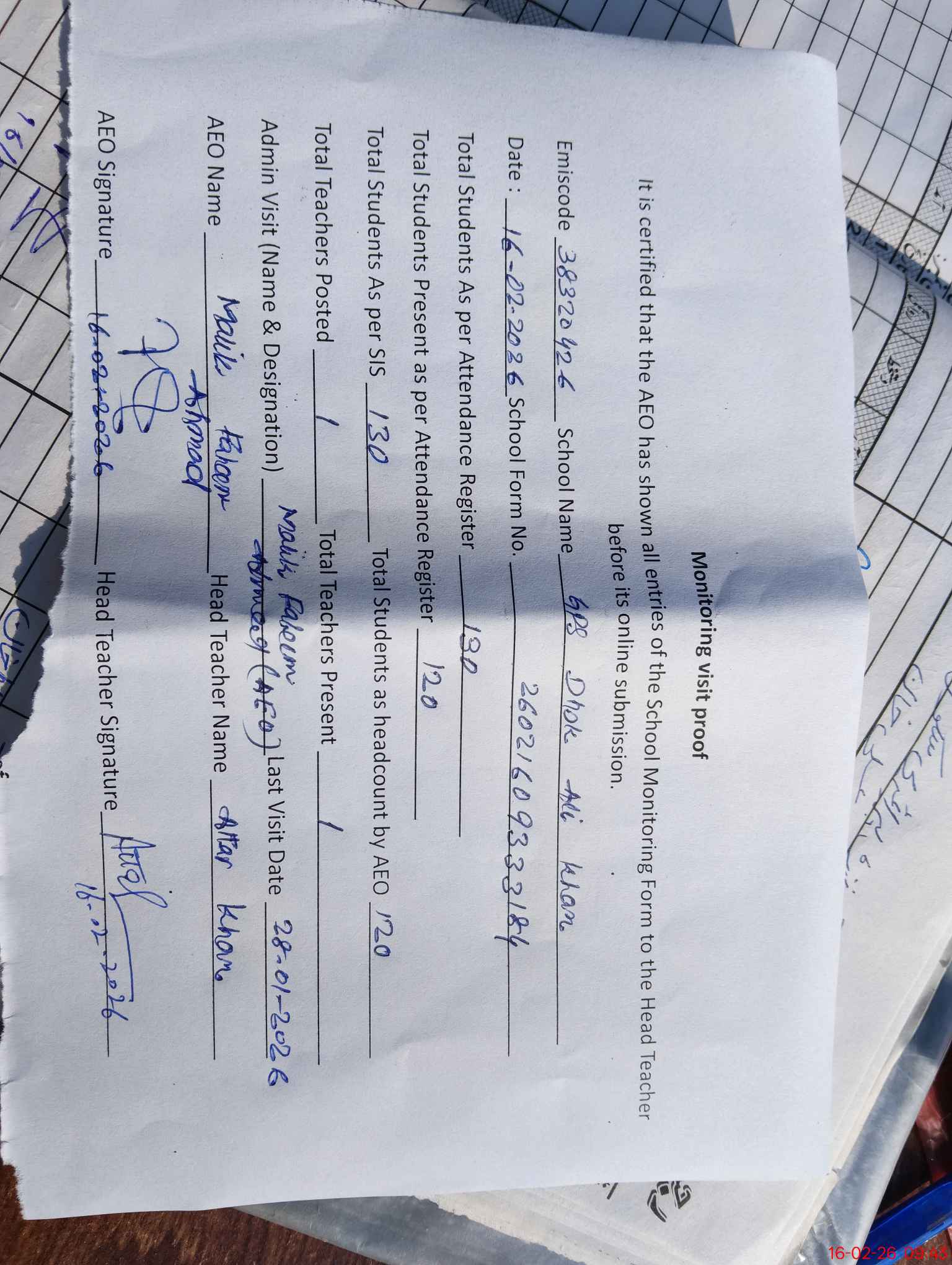 | Attendance Register | Head Teacher | MEA with School | Visit Proof |