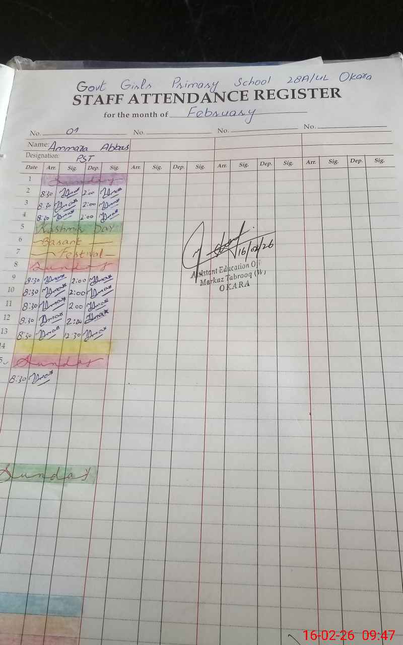 | District: OKARA | Tehsil: OKARA | Markaz: TABROOQ - FEMALE | Level: Primary | |