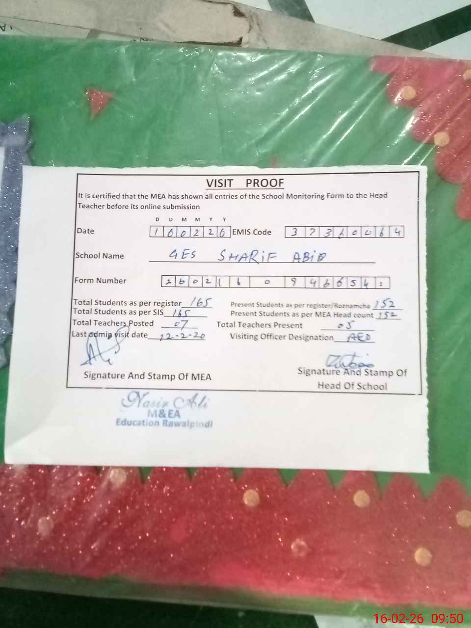 | Certified that this School was Inspected by the Undersigned MEA/DMO Today and the Information Stated Above is as Per Record. | |||||