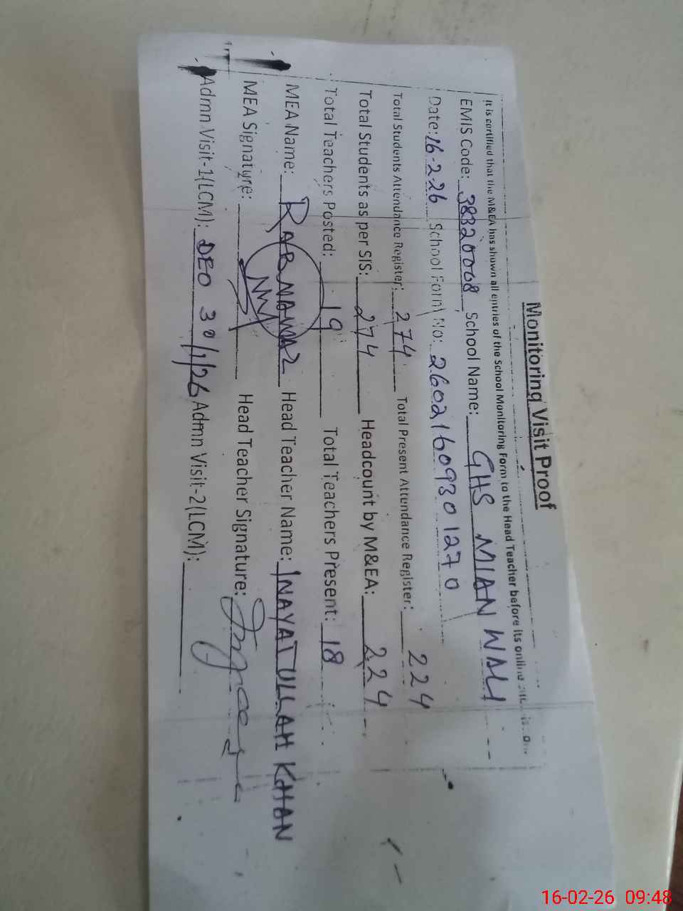 | Certified that this School was Inspected by the Undersigned MEA/DMO Today and the Information Stated Above is as Per Record. | |||||