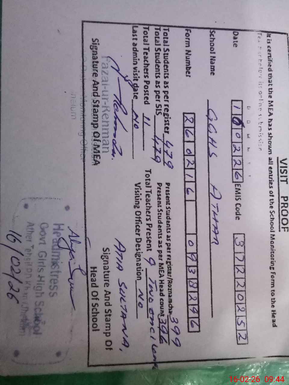 | Attendance Register | Head Teacher | MEA with School | Visit Proof |