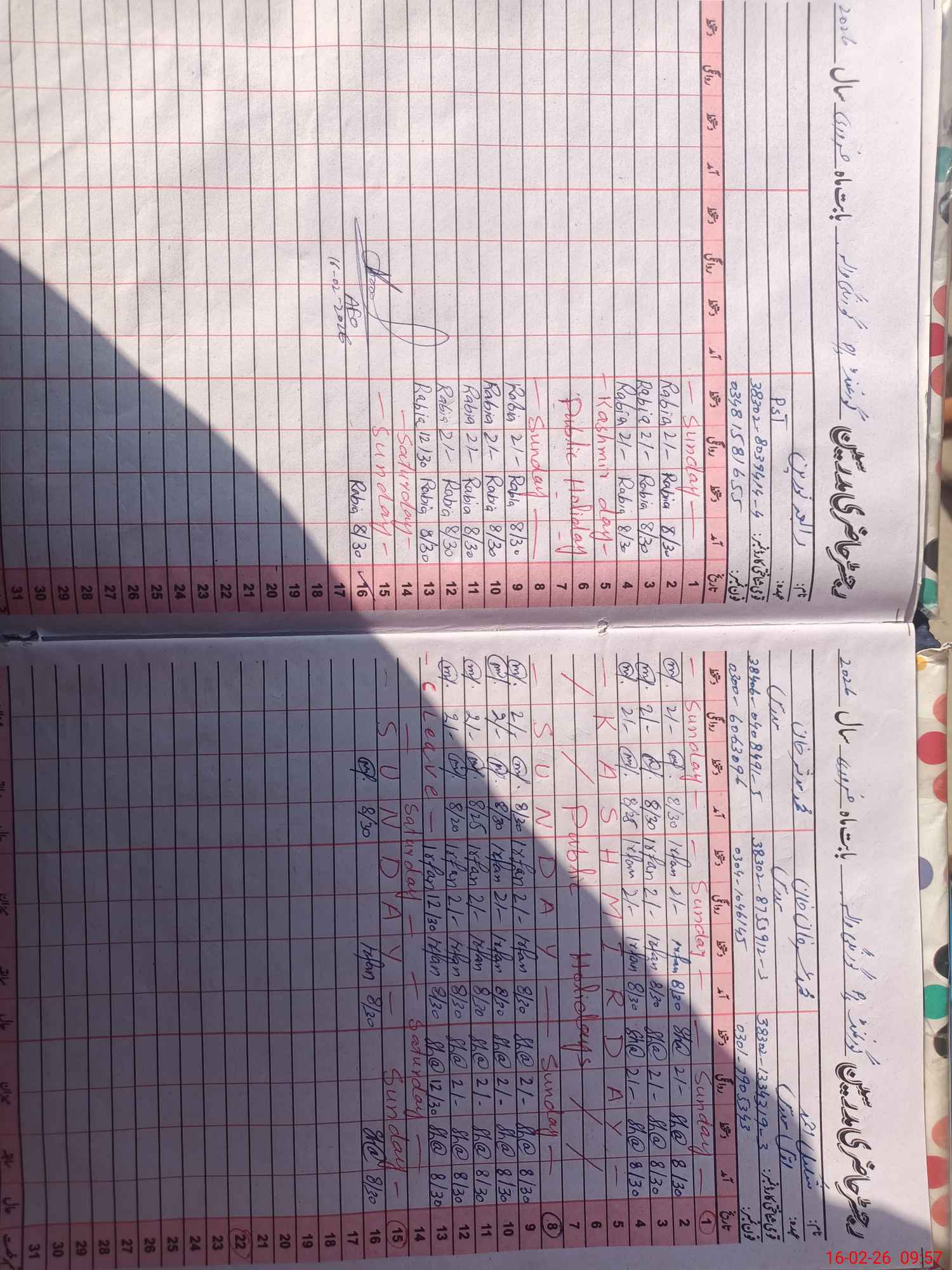 | CNIC | Full Name | Designation | R/C | Absence During Last Calender Month |