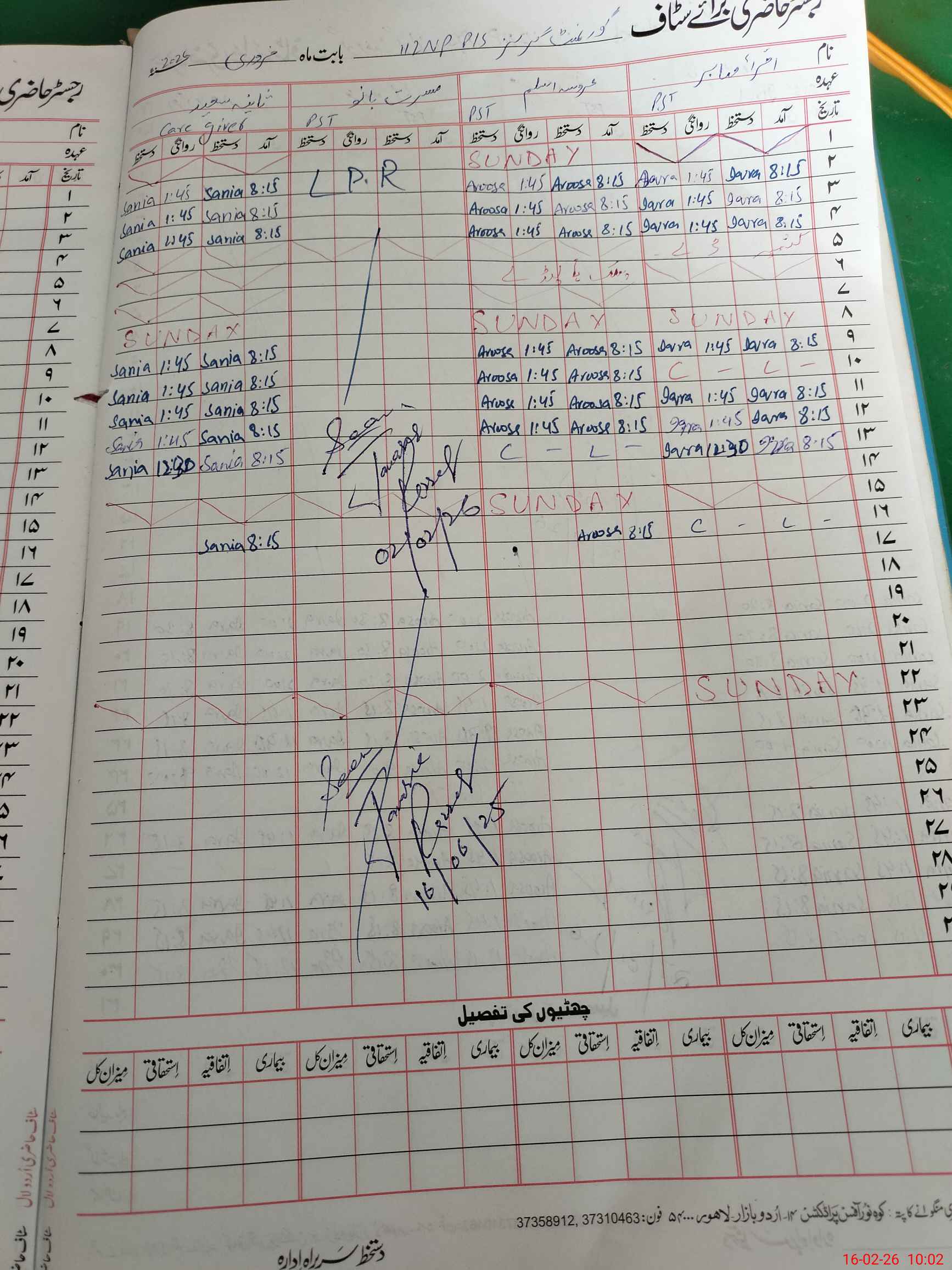 | CNIC | Full Name | Designation | R/C | Absence During Last Calender Month |