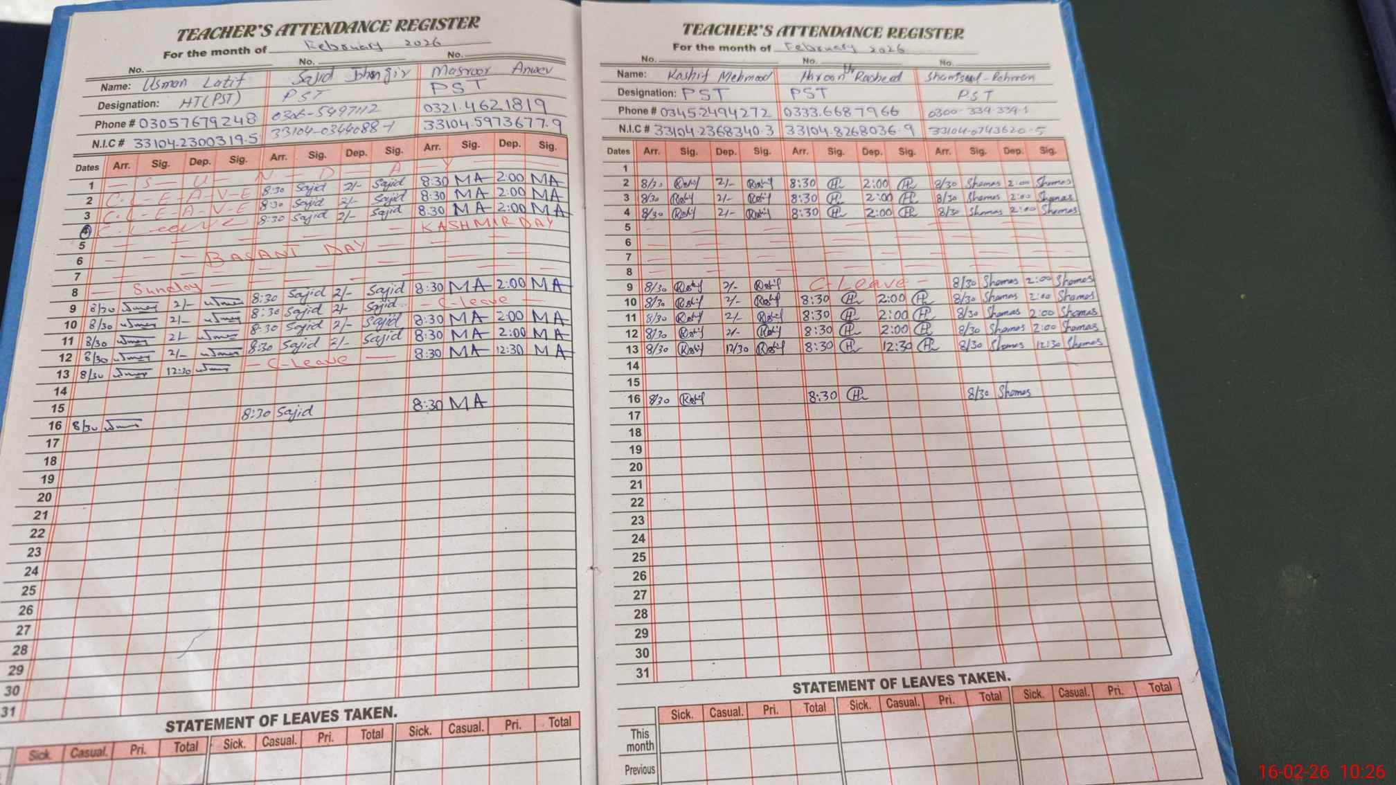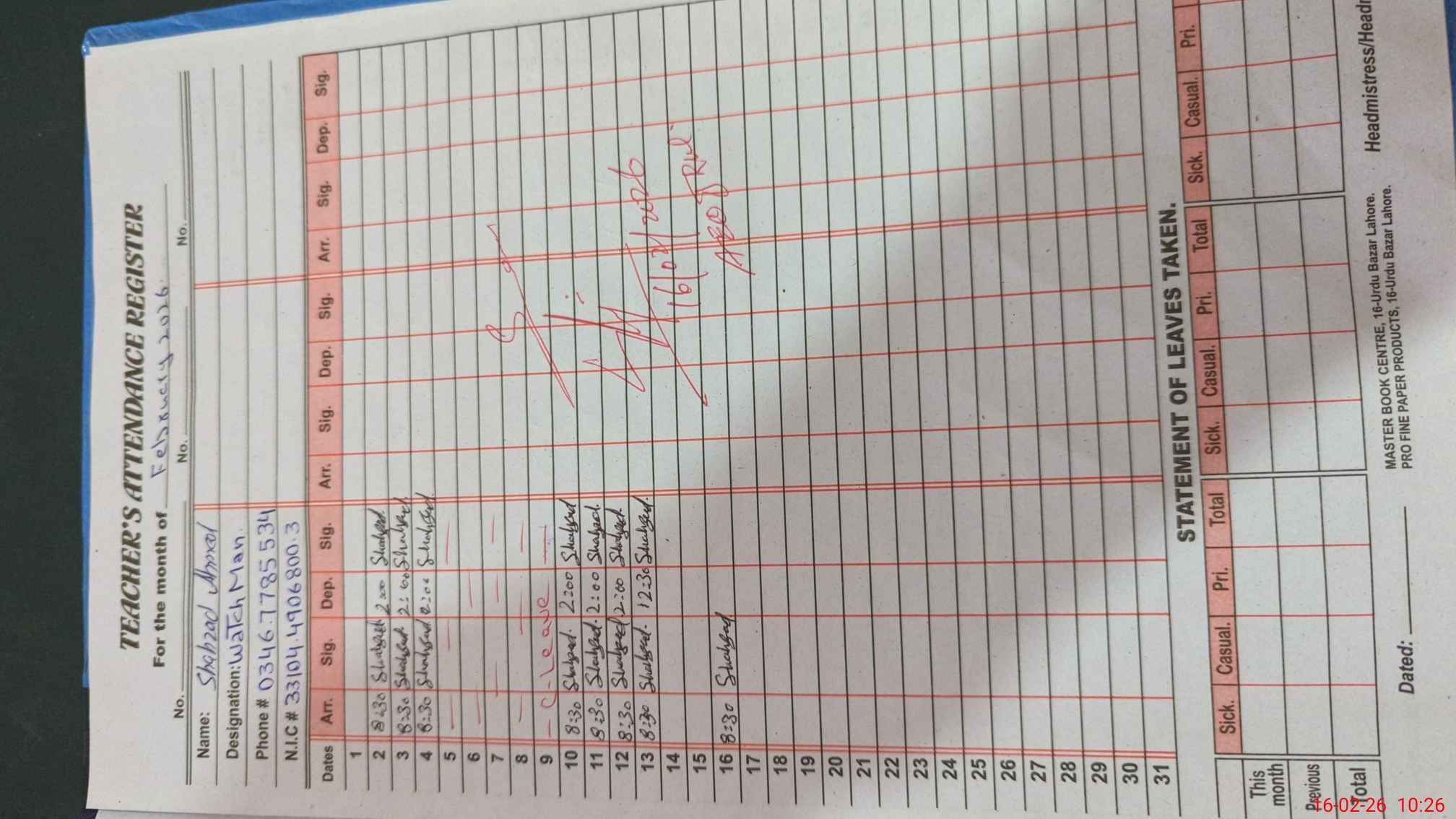 | CNIC | Full Name | Designation | R/C | Absence During Last Calender Month |