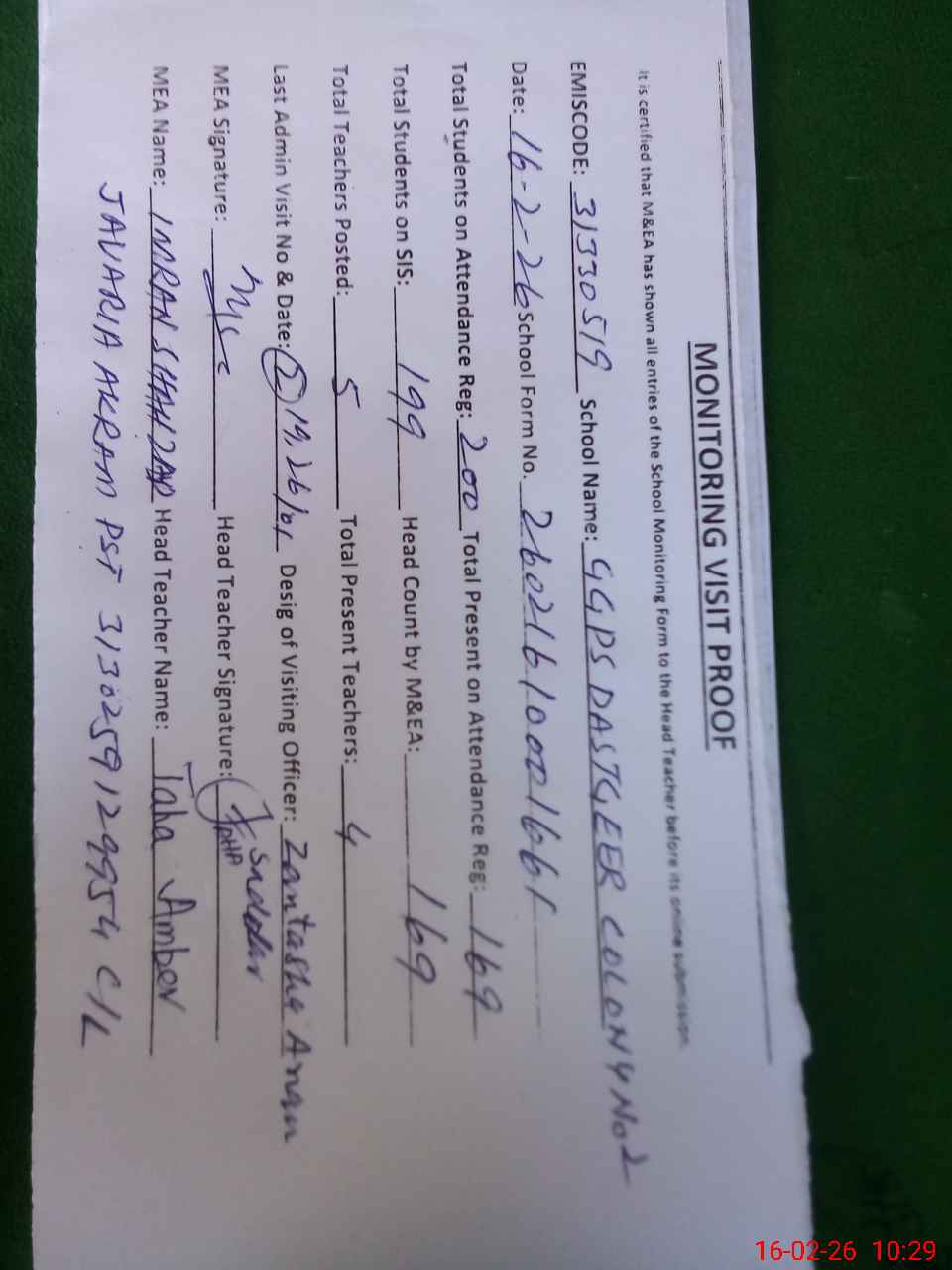 | Attendance Register | Head Teacher | MEA with School | Visit Proof |