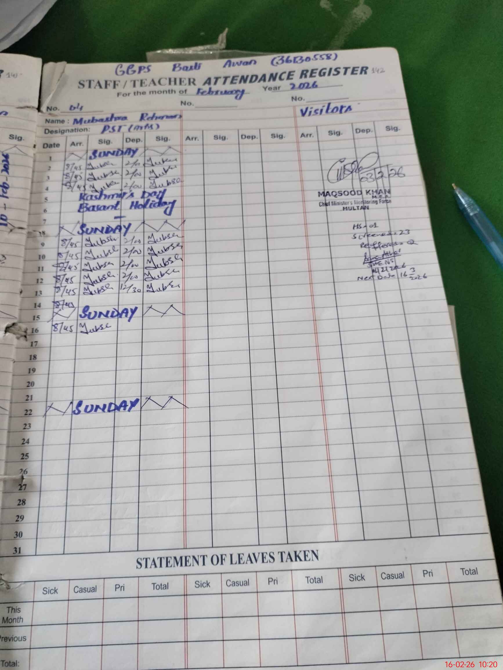 | Attendance Register | Head Teacher | MEA with School | Visit Proof |