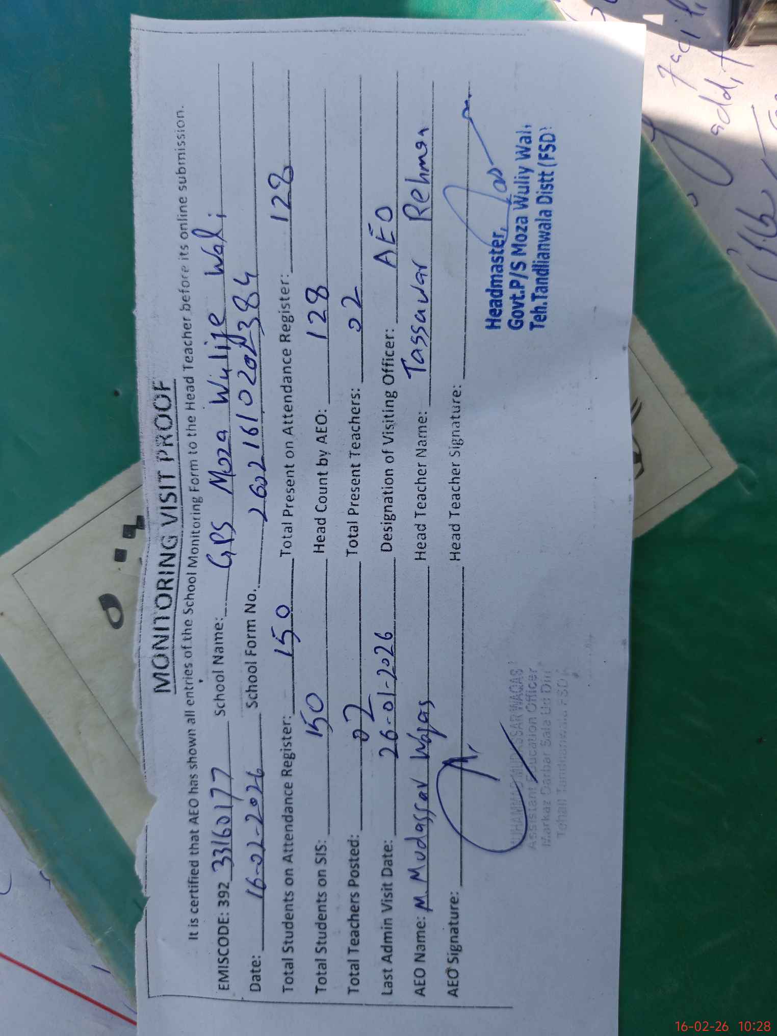 | Attendance Register | Head Teacher | MEA with School | Visit Proof |