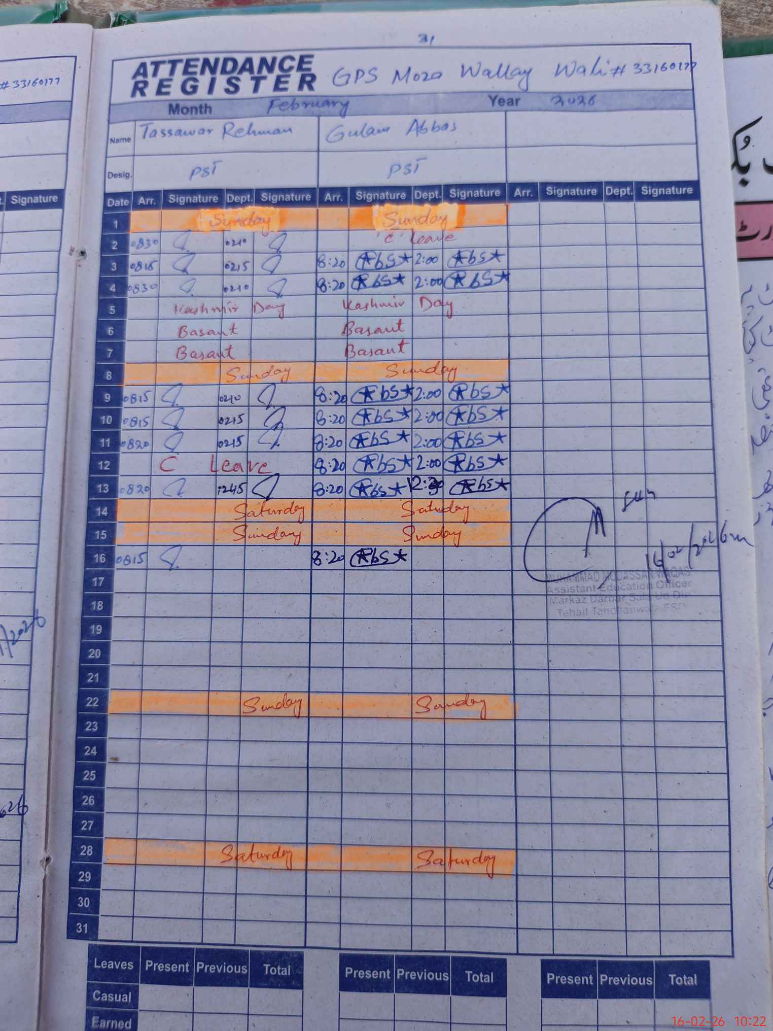 | CNIC | Full Name | Designation | R/C | Absence During Last Calender Month |