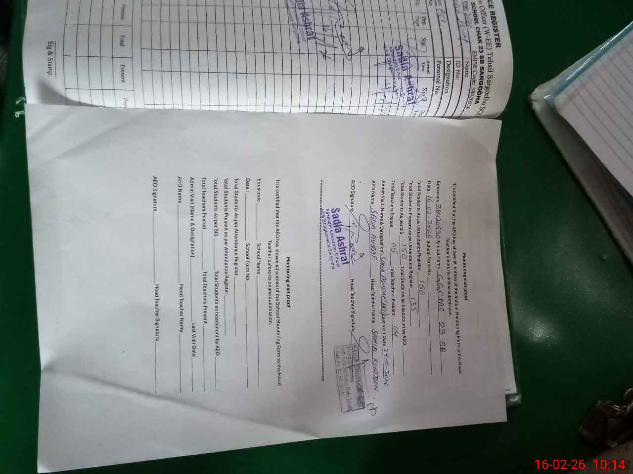 | Attendance Register | Head Teacher | MEA with School | Visit Proof |