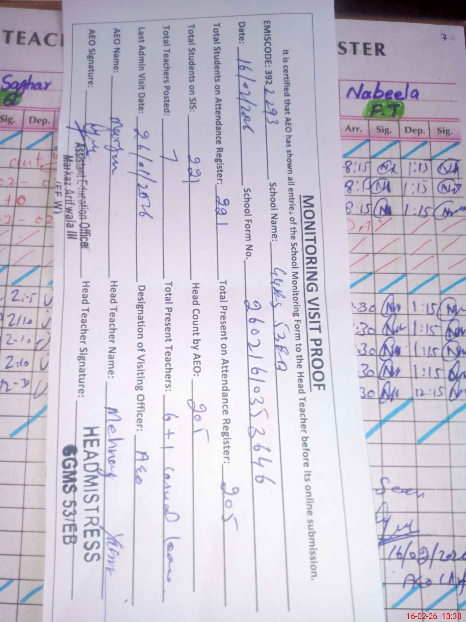 | Attendance Register | Head Teacher | MEA with School | Visit Proof |