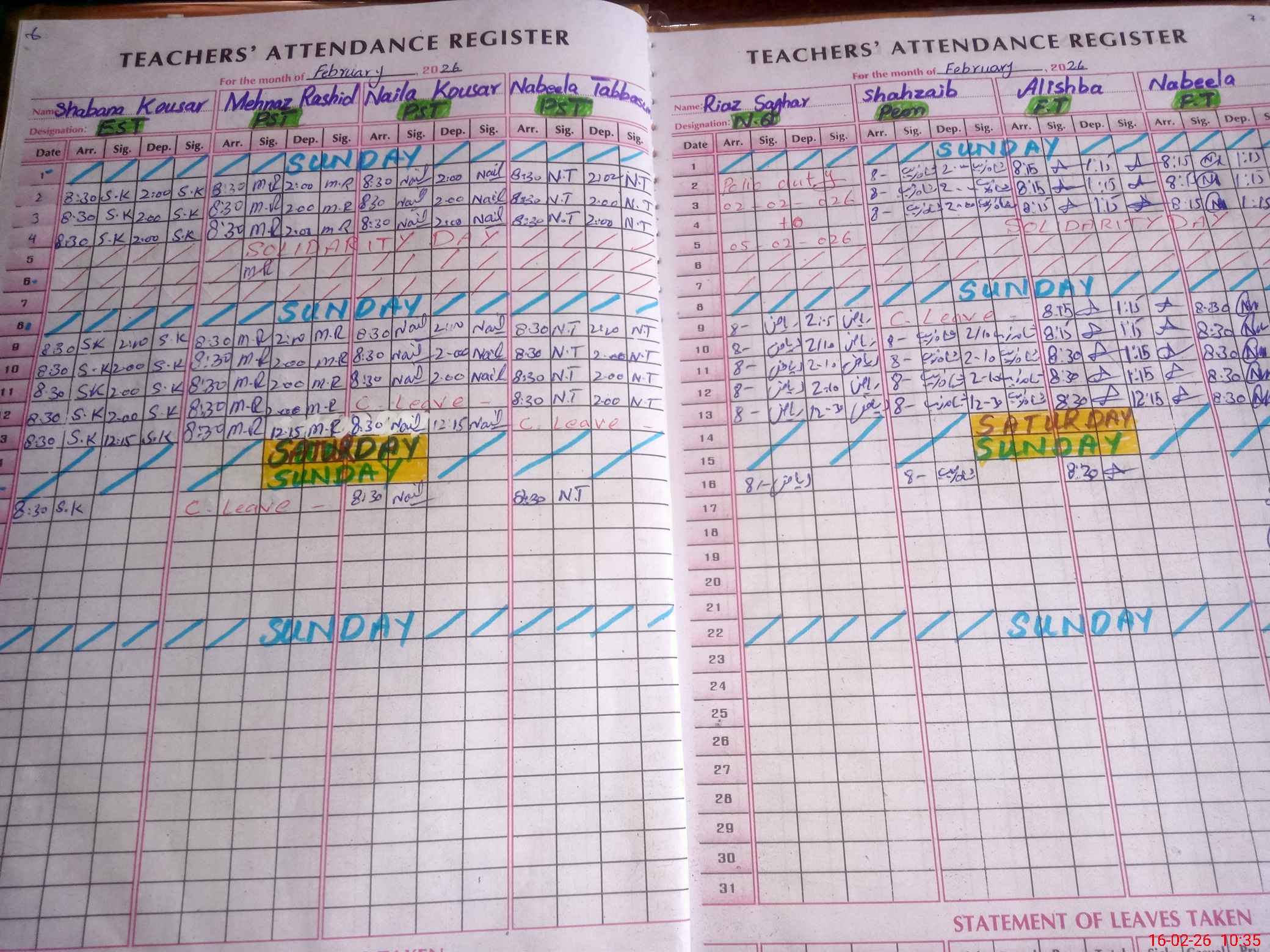 | Leave | Duty | Absent | Maternity | Medical | Ex- Pak |