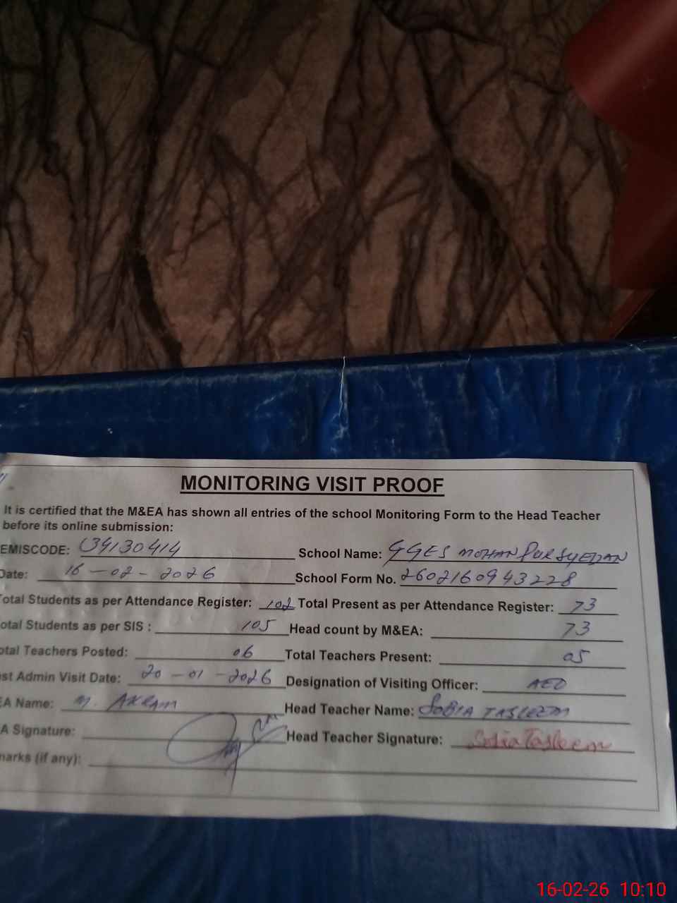 | Certified that this School was Inspected by the Undersigned MEA/DMO Today and the Information Stated Above is as Per Record. | |||||