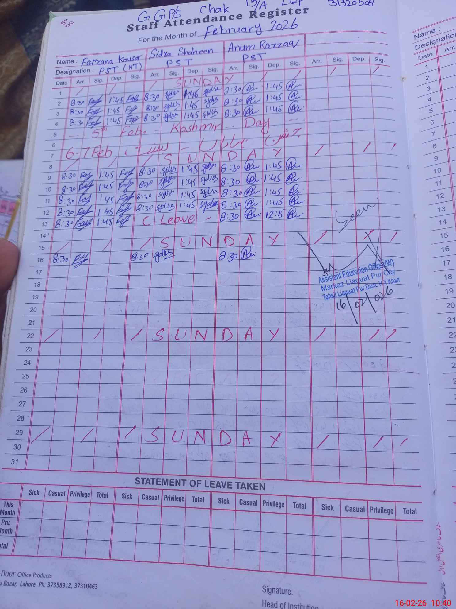 | Name: Fa**** Ku**** Designation: (School Headmaster's/Headmistress's) PST Phone/Cell Number: 03**** |