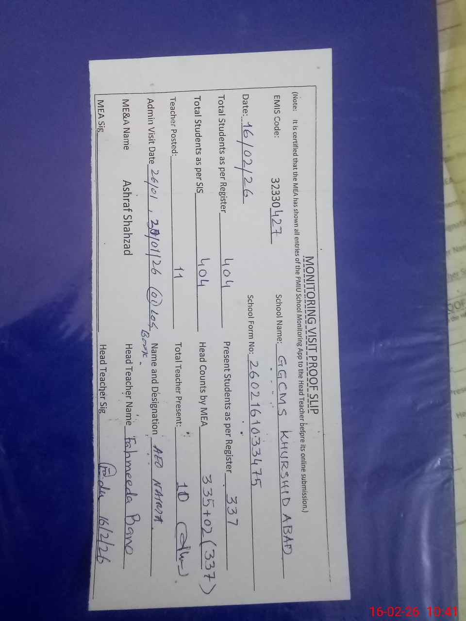 | EMIS Code: 32330427 | Name of School: GGCMS KHURSHID ABAD | |||
