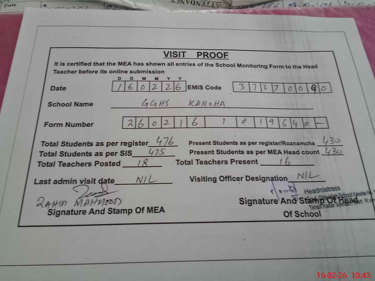 | Certified that this School was Inspected by the Undersigned MEA/DMO Today and the Information Stated Above is as Per Record. | |||||