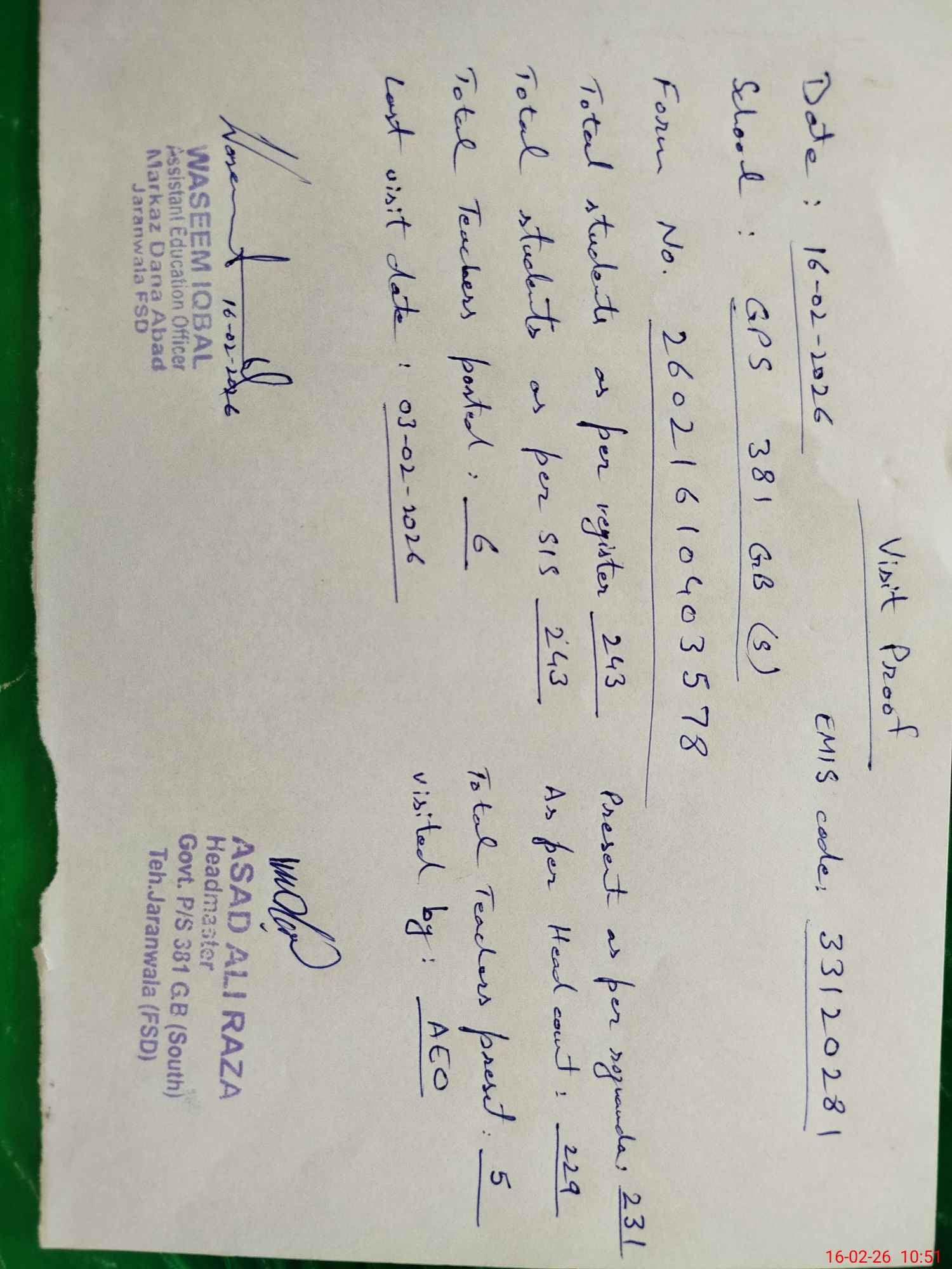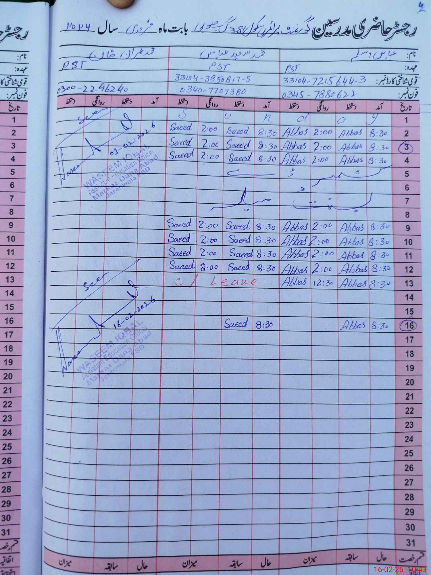 | Name: Za**** Iq**** Designation: (School Headmaster's/Headmistress's) PST(HEAD TEACHER ) Phone/Cell Number: 03**** |