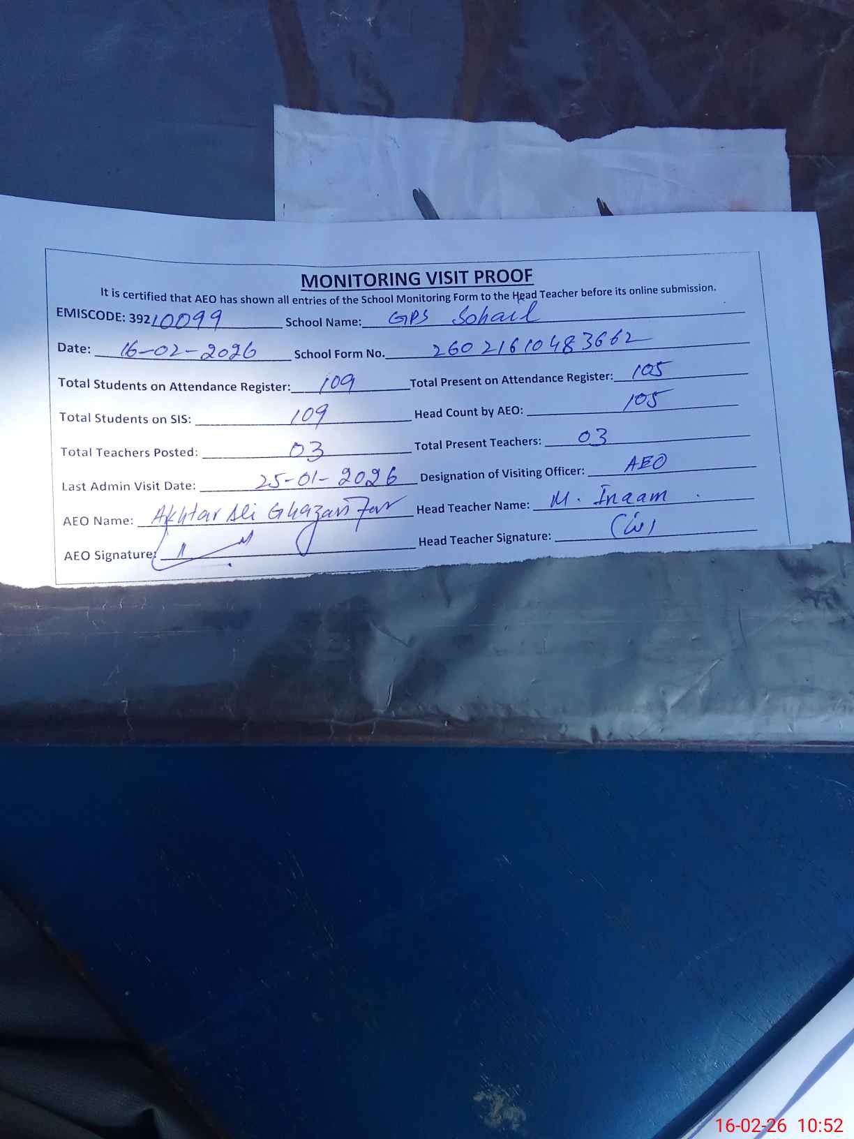 | EMIS Code: 39210099 | Name of School: GPS SOHAIL P/O 27/SP | |||