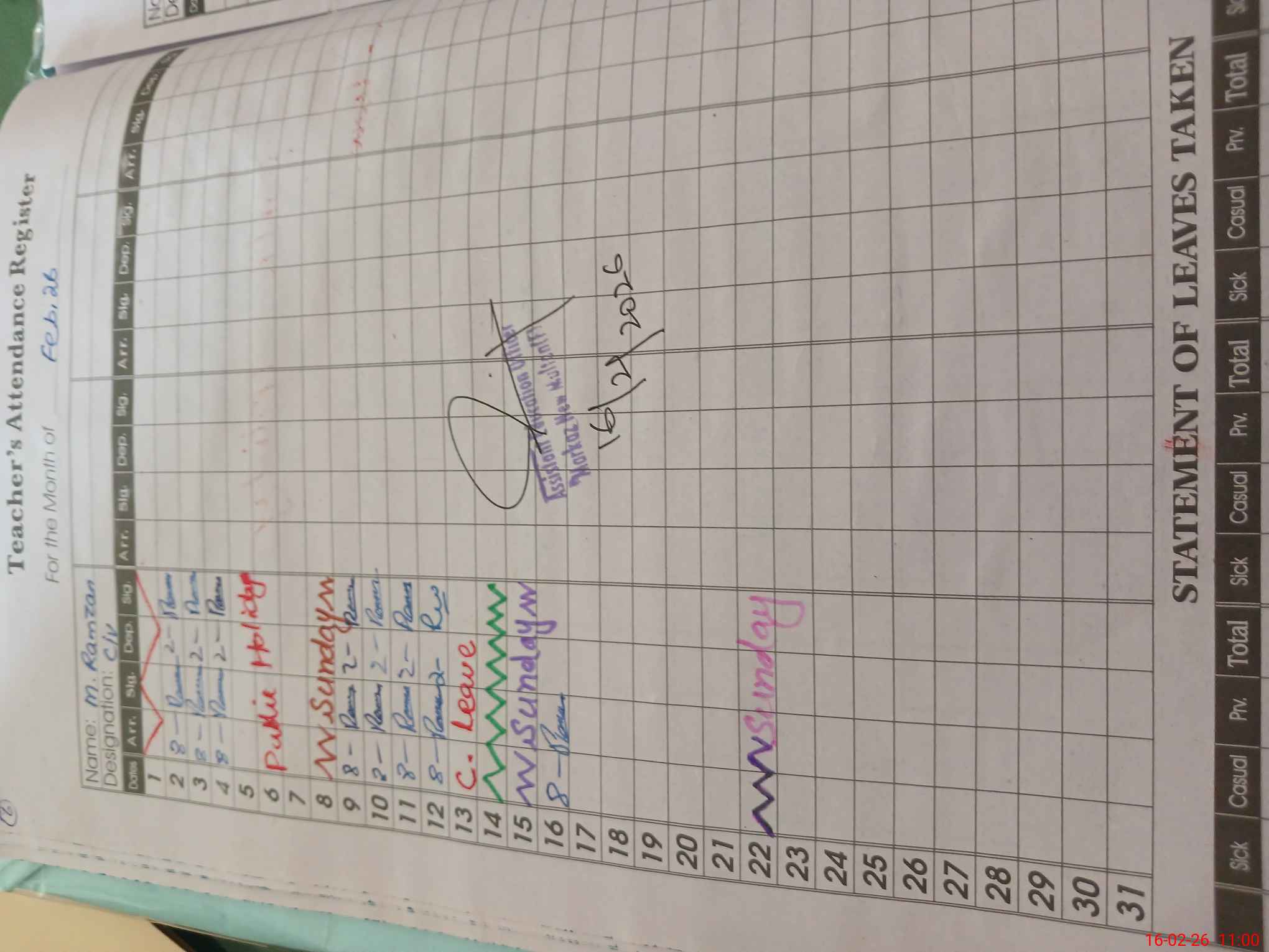 | CNIC | Full Name | Designation | R/C | Absence During Last Calender Month |