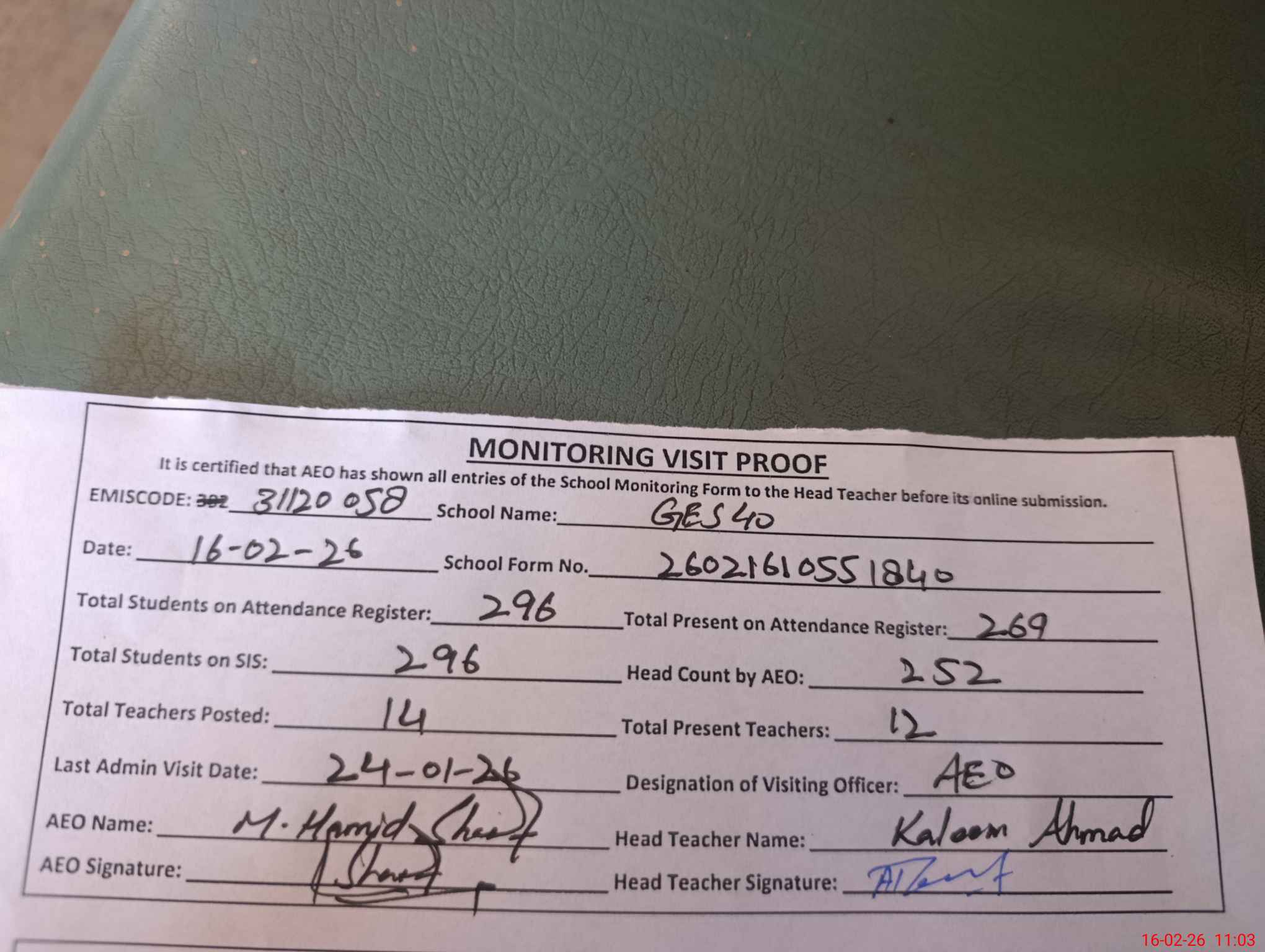 | EMIS Code: 31120058 | Name of School: GES CHAK NO 40/F | |||