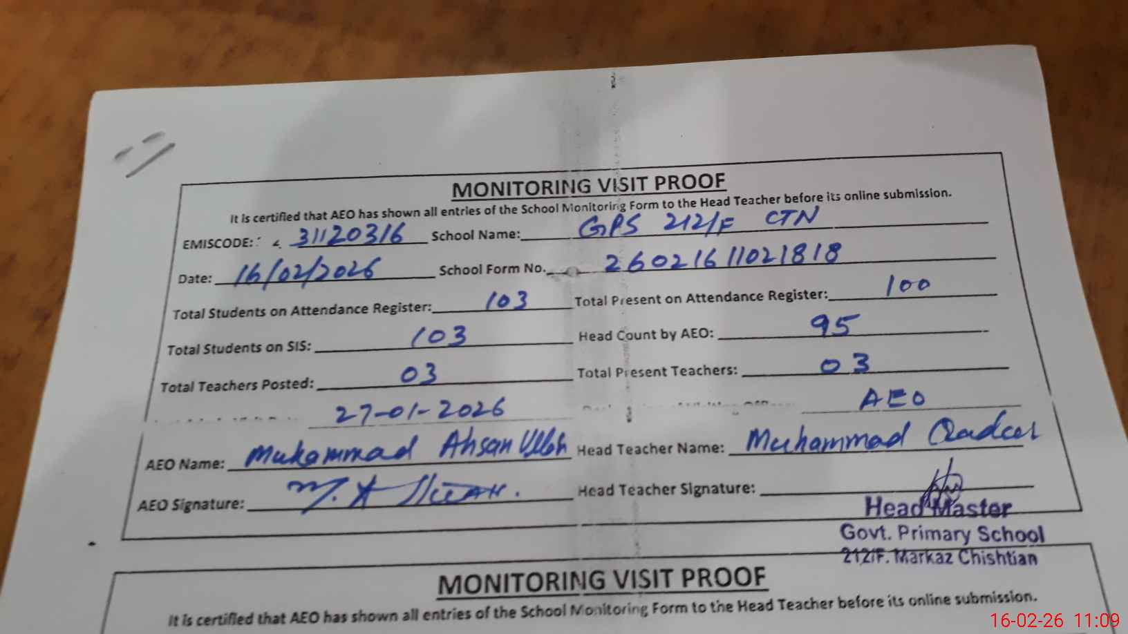 | Attendance Register | Head Teacher | MEA with School | Visit Proof |