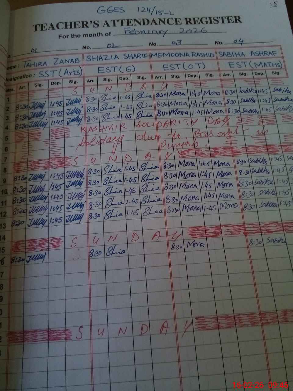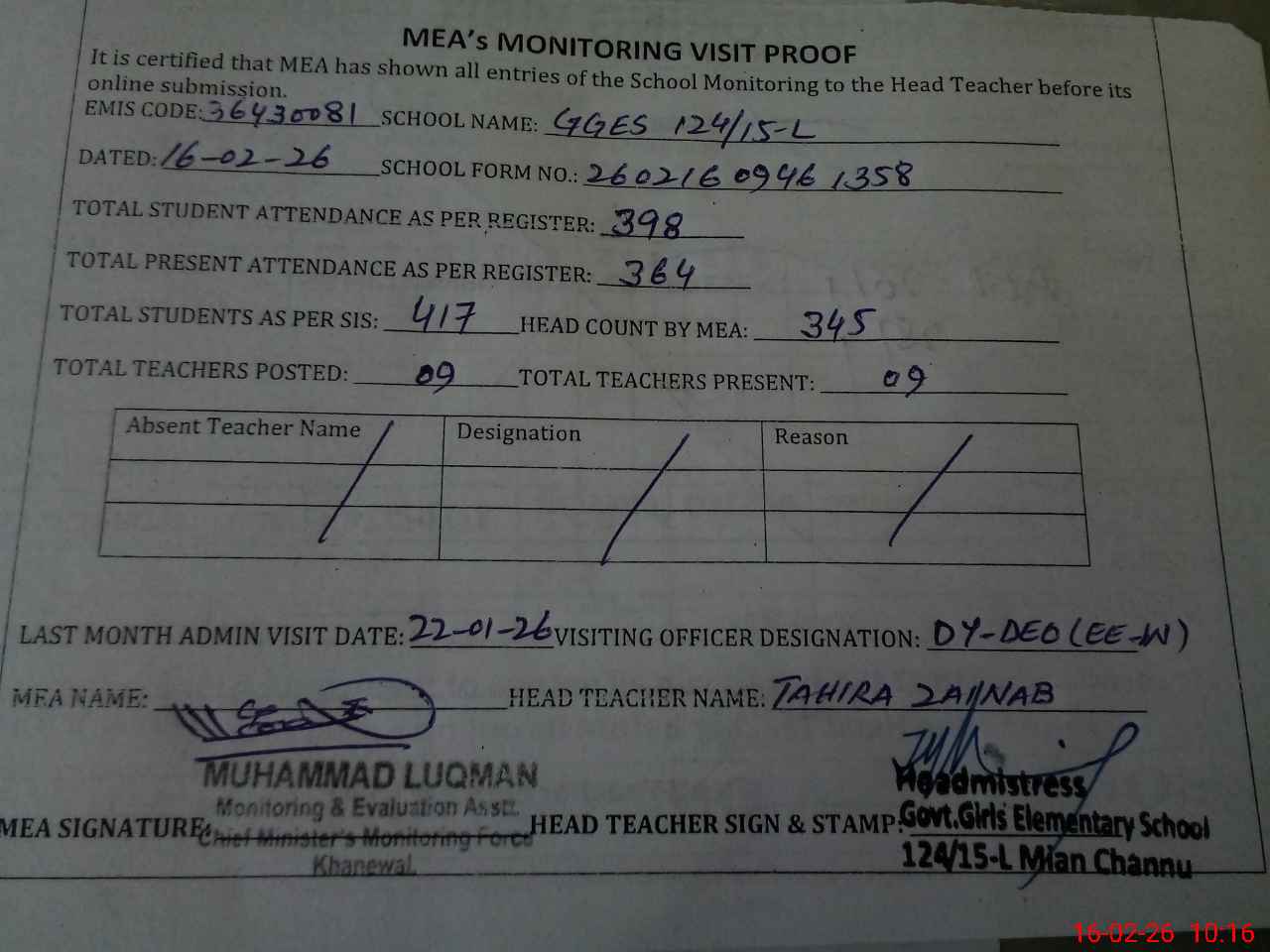 | Monitoring Date: 16-02-2026 | Start Time: 16-02-2026 09:28 AM | End Time: 16-02-2026 10:18 AM | Name of MEA: Mu**** Lu**** | |
