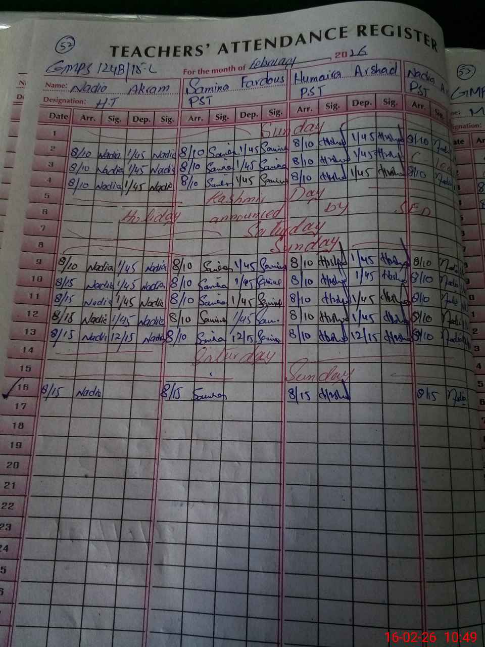 | CNIC | Full Name | Designation | R/C | Absence During Last Calender Month |