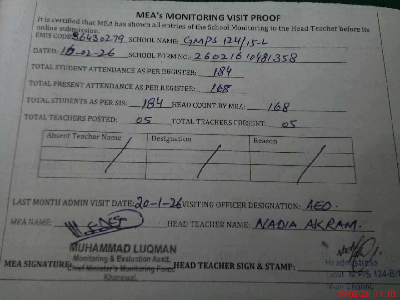| Monitoring Date: 16-02-2026 | Start Time: 16-02-2026 10:22 AM | End Time: 16-02-2026 11:11 AM | Name of MEA: Mu**** Lu**** | |