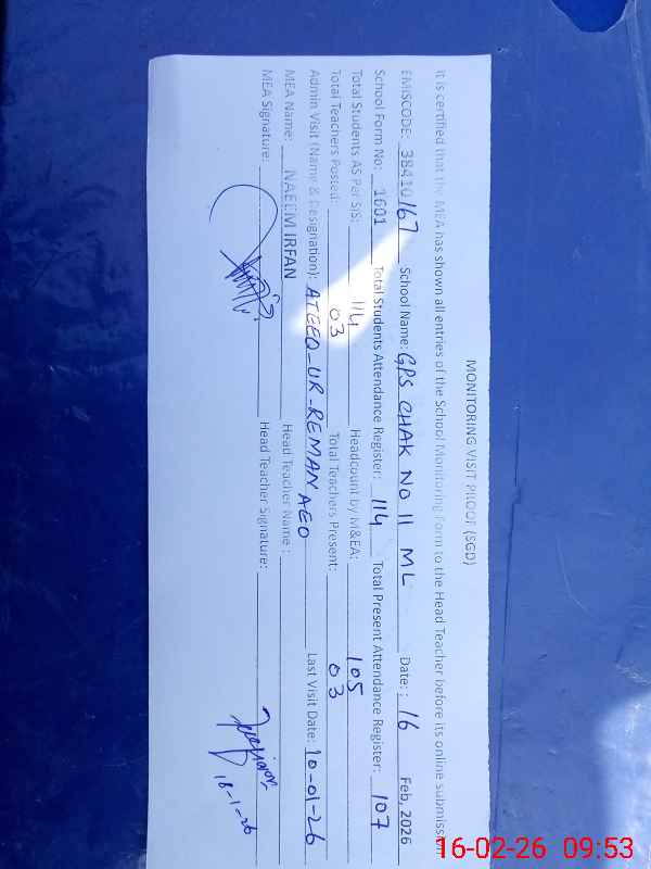 | EMIS Code: 38410167 | Name of School: GPS CHAK NO.11 ML | |||