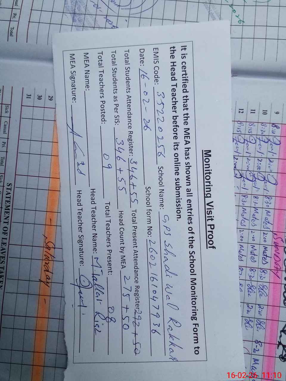 | Attendance Register | Head Teacher | MEA with School | Visit Proof |