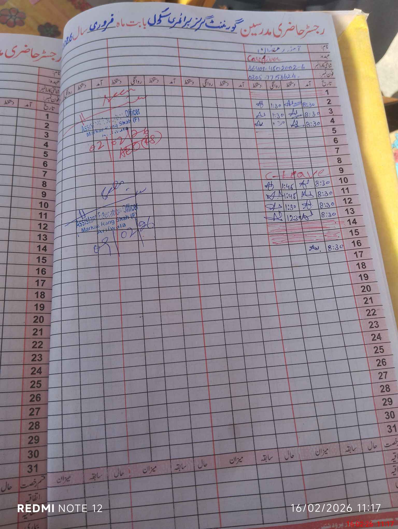 | Name: AZ**** PA**** Designation: (School Headmaster's/Headmistress's) PST Phone/Cell Number: 03**** |