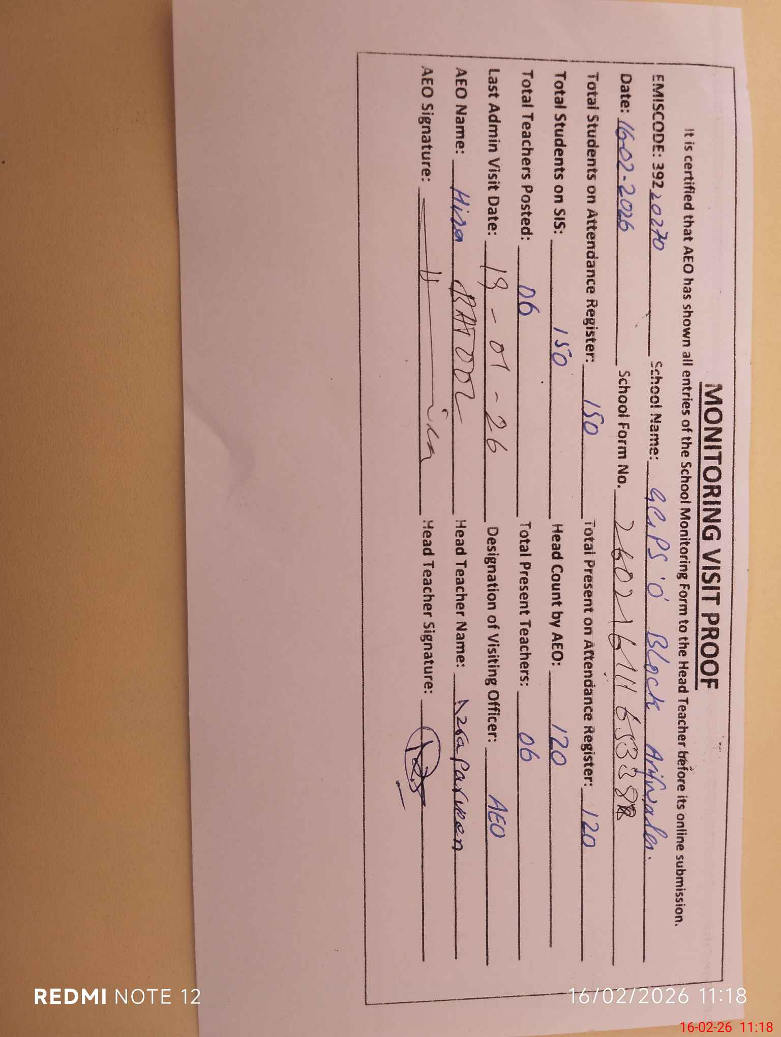 | Attendance Register | Head Teacher | MEA with School | Visit Proof |