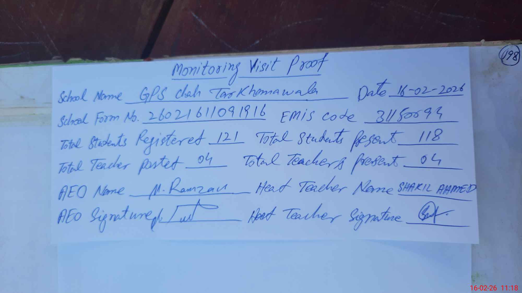 | EMIS Code: 31150094 | Name of School: GPS CHAH TARKHANA WALA | |||