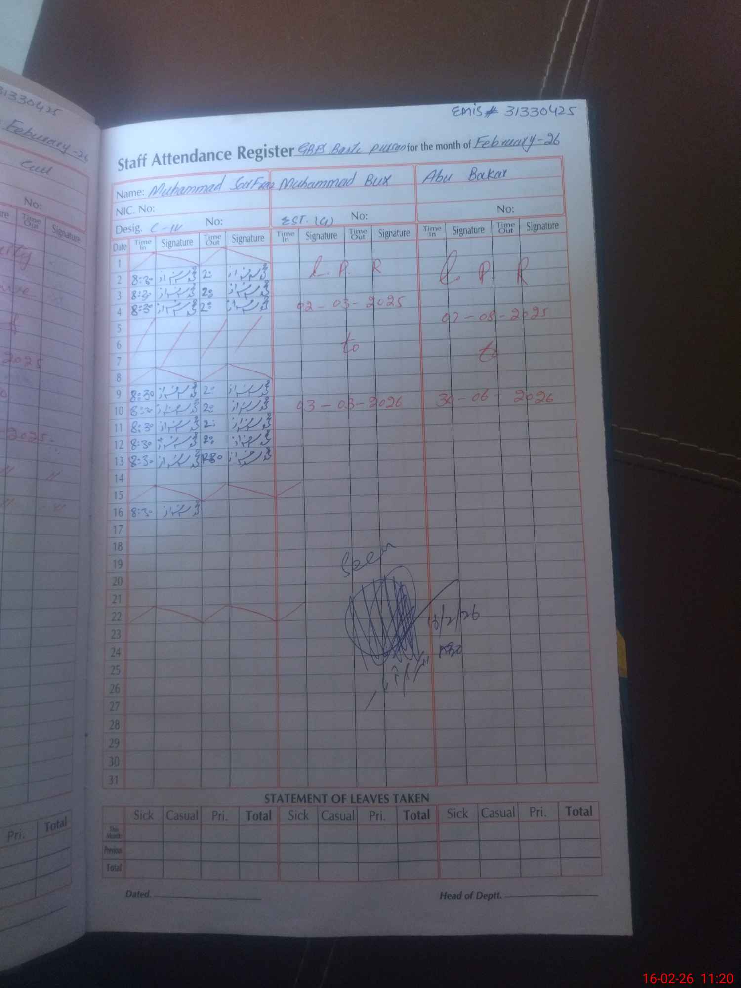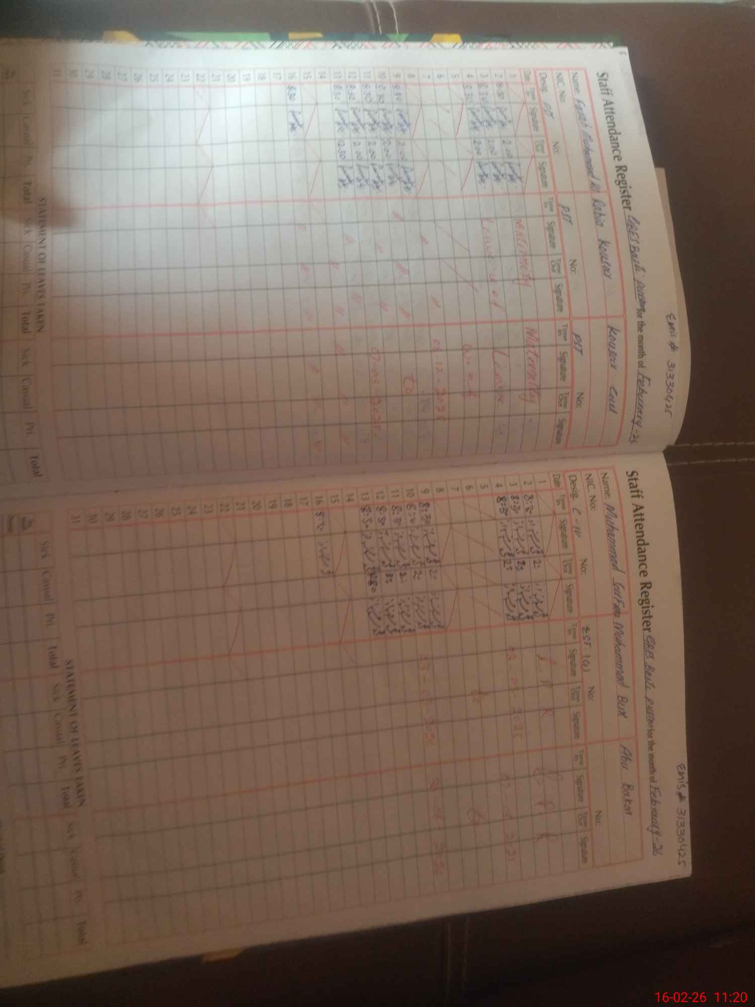 | CNIC | Full Name | Designation | R/C | Absence During Last Calender Month |