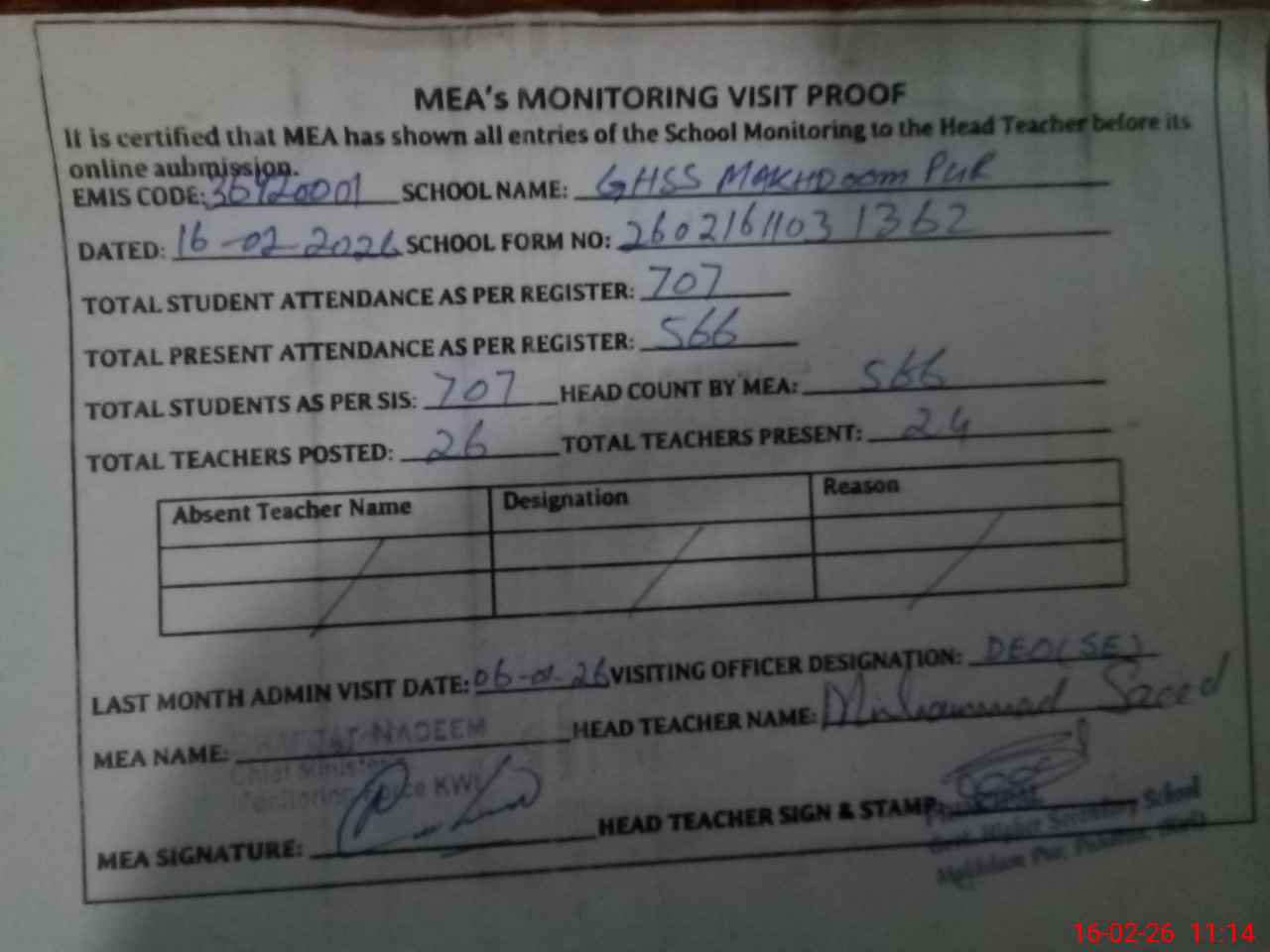 | Attendance Register | Head Teacher | MEA with School | Visit Proof |