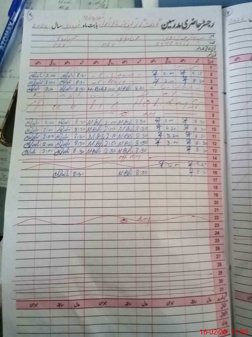 | CNIC | Full Name | Designation | R/C | Absence During Last Calender Month |