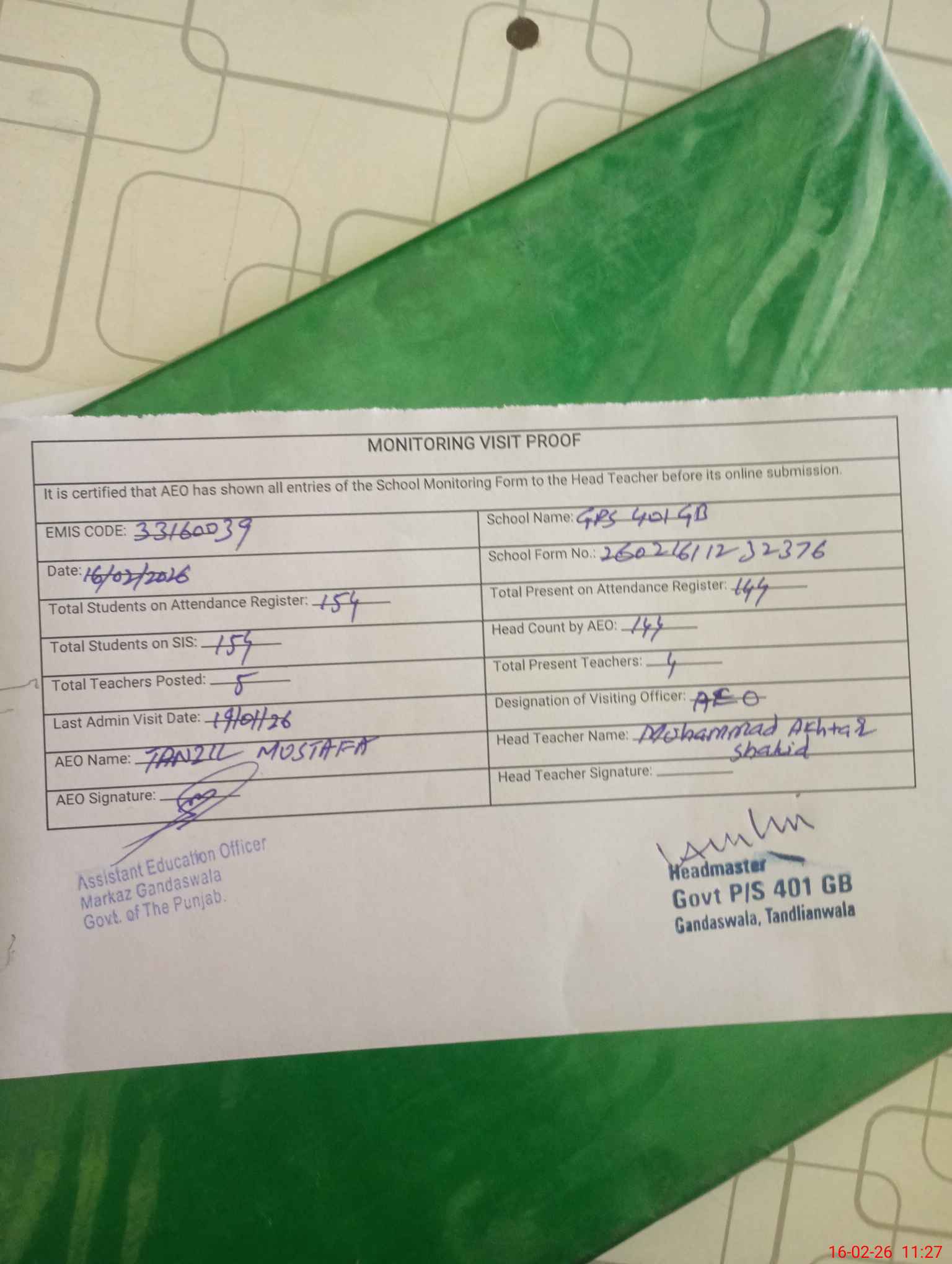 | EMIS Code: 33160039 | Name of School: GPS CHAK 401 GB TANDLIANWALA | |||